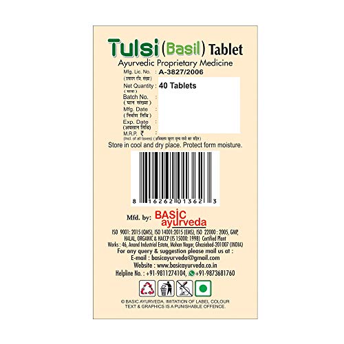 • Basic Ayurveda's Tulsi Tablet is an Ayurvedic herb. Helpful for colds and coughs. Basil tablet due to its unique combination of Anti-microbial Anti-inflammatory and anti-oxidant actions helps in respiratory health.