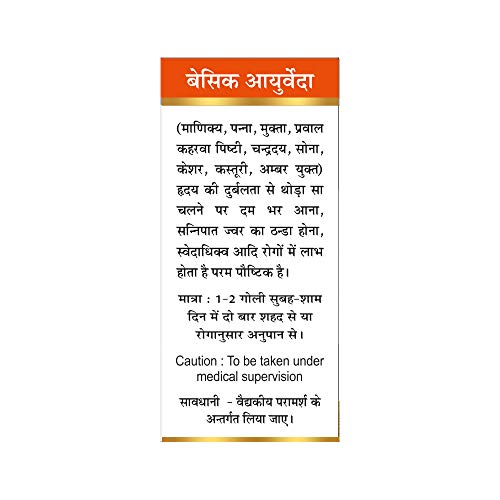 • Basic Ayurveda Yakuti Rasayan with Gold & Pearl is an ayurvedic formulation. That acts as general heart wellness temperature and excessive sweating. It may provide strength and nutrition to the heart and normalizes the heart rate.