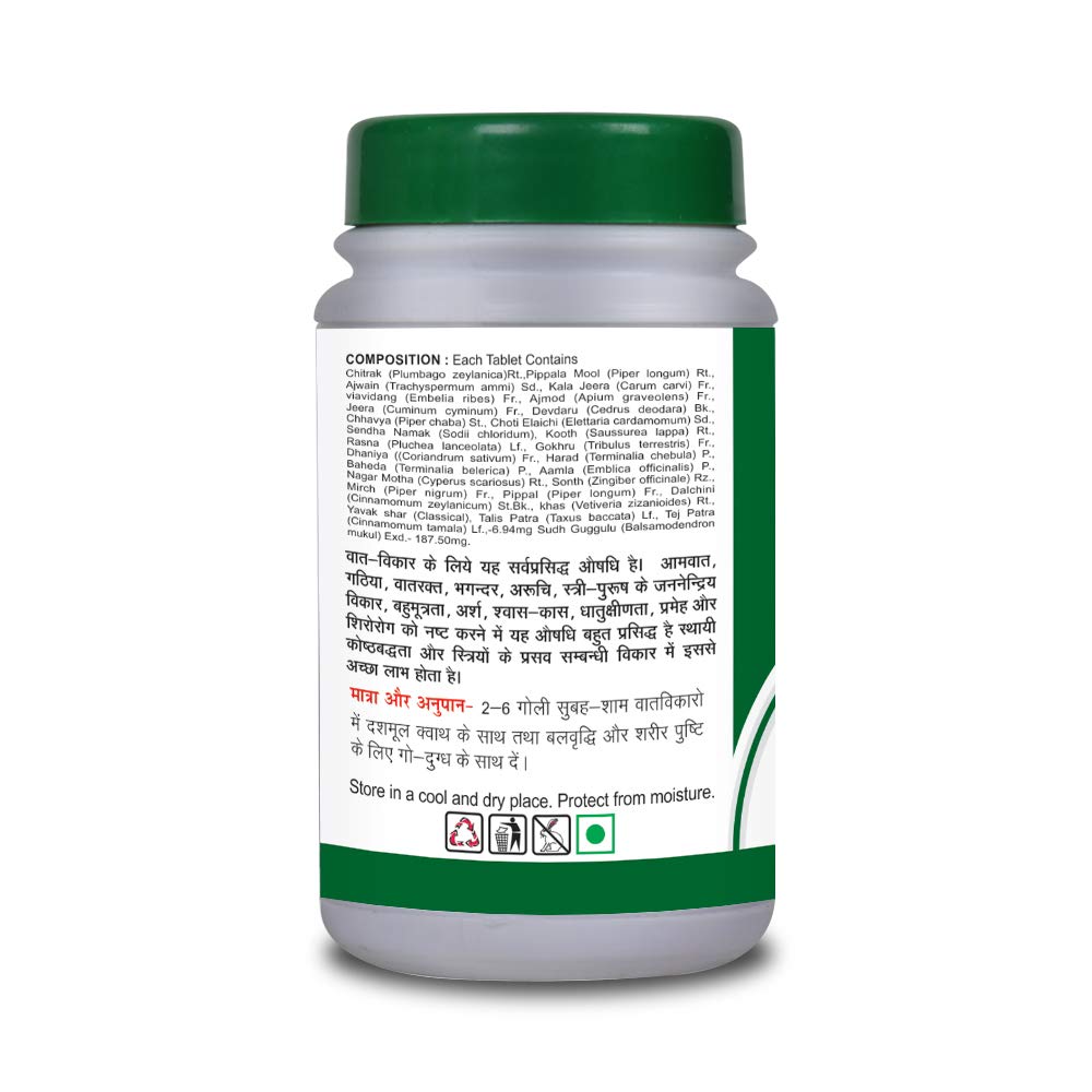 • It is a well-known tablet for Vata and maintains healthy digestion constipation bloating indigestion metabolism eye inflammation and swelling.