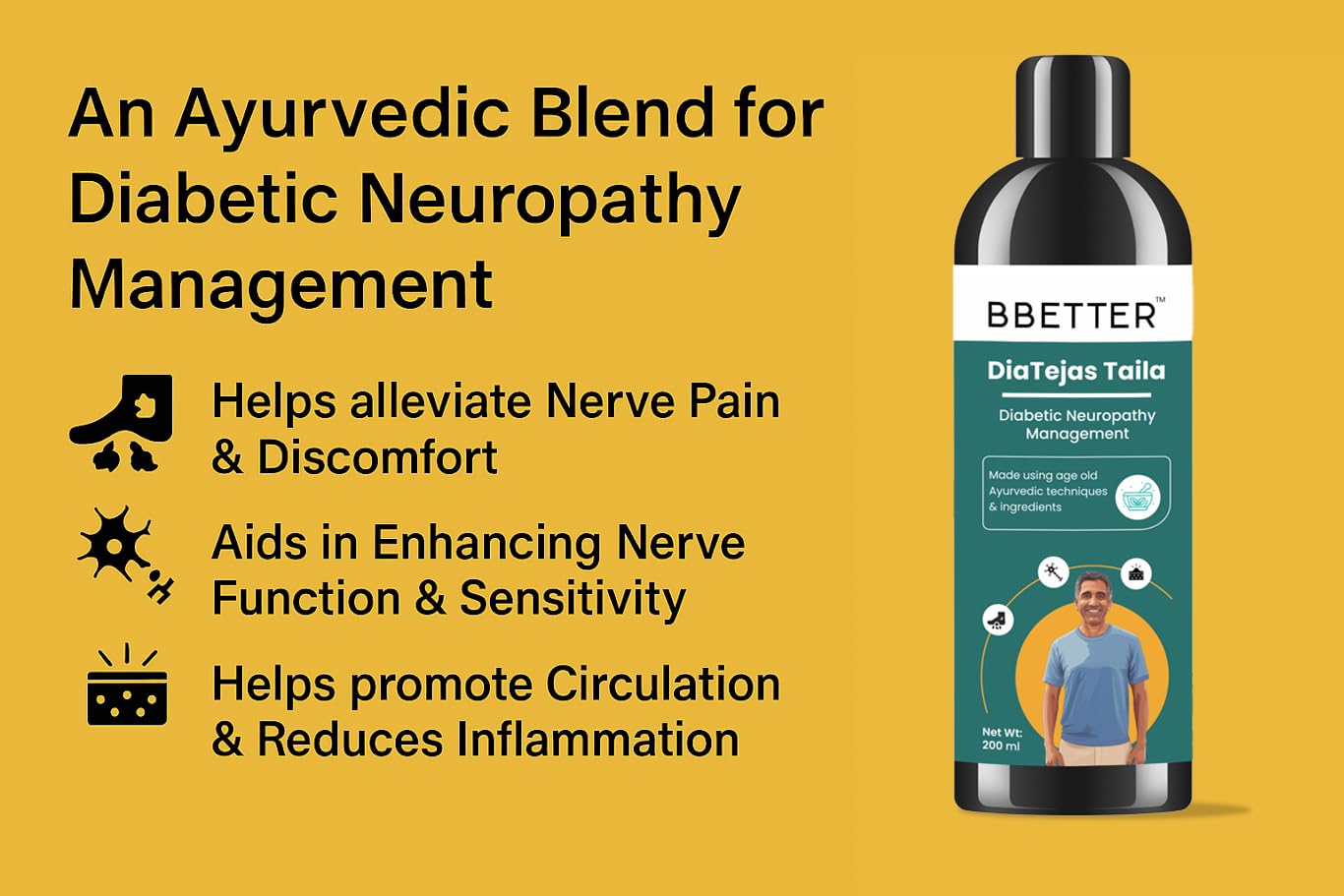 BBETTER DiaTejas Taila is a traditional Ayurvedic foot oil formulated with cooling and nerve-supporting herbs inspired by classical Ayurvedic texts. It is crafted to help ease discomfort commonly experienced in the soles toes and lower limbs because of diabetes including sensations of heat tingling or fatigue. Enriched with herbs known for their balancing and rejuvenating properties this oil is ideal for daily massage especially before bedtime. Its soothing effect may support microcirculation reduce dryness and calm irritated tissues.