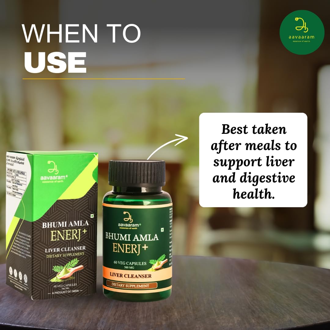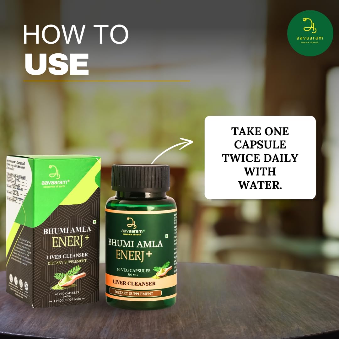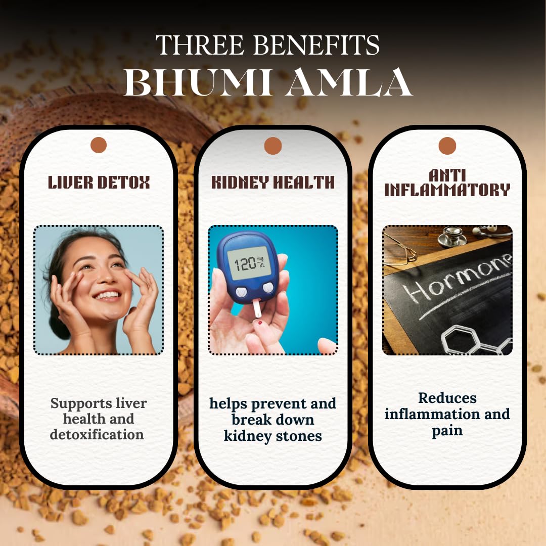 Bhumi Amla Capsules â Liver Support Made Simple Discover the ancient healing power of Bhumi Amla (Phyllanthus niruri) in our easy-to-use capsules. Each bottle contains 60 vegetarian capsules made from finely powdered 100% natural Bhumi Amla. Supports liver health and detoxification. Aids in maintaining healthy digestion and metabolism. Rich in antioxidants for overall wellness. Pure natural and free from additives. Vegetarian-friendly and perfect for daily use. Usage: Take 1-2 capsules daily with water or as directed by a healthcare professional. Revitalize your health and restore balance with our Bhumi Amla Capsules!