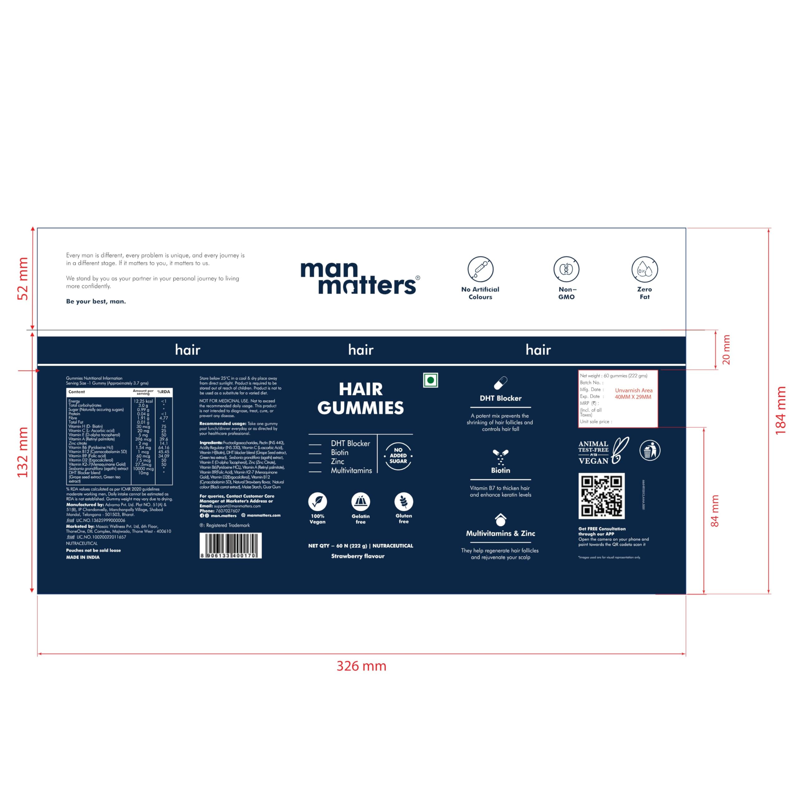 HomeHealth & PersonalDiet & NutritionHealth SupplementsMan Matters Biotin Hair Gummies (60N) | No Added Sugar | With Biotin DHT Blockers Vitamin A C E Fibre & Zinc | For Stronger and Healthier Hair | 100% Veg & Gut Friendly