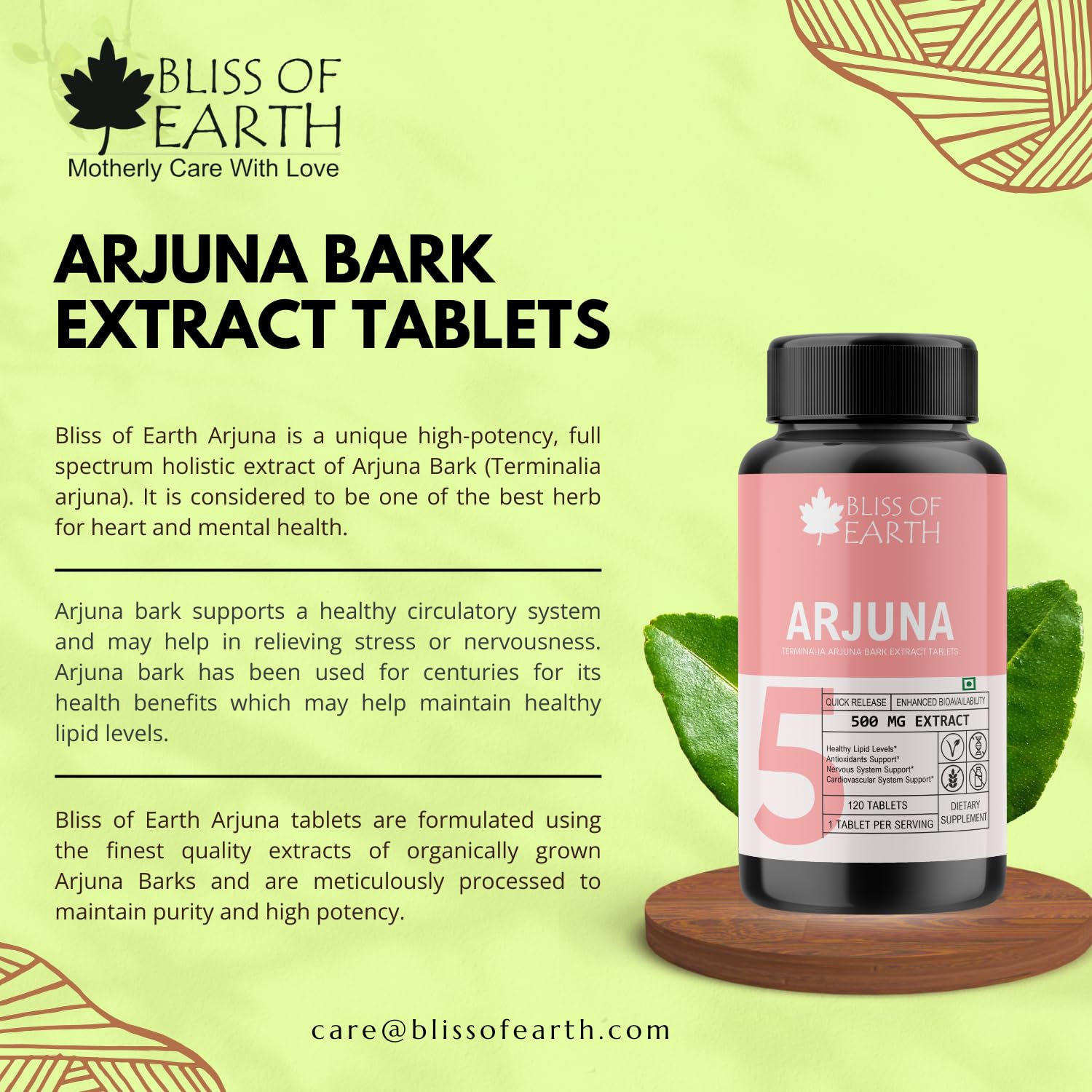 Bliss of Earth Arjuna scientifically known as Terminalia arjuna is a revered herbal supplement celebrated for its potential cardiovascular benefits. These Arjuna tablets offer a convenient and standardized way to incorporate the natural goodness of this traditional Ayurvedic herb into your daily wellness regimen.
