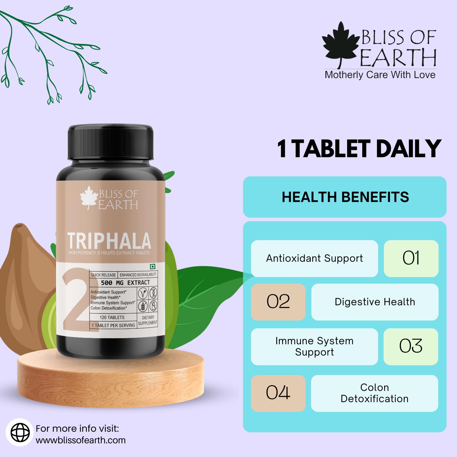 Bliss of Earth High Potency Triphala Extract Tablets 500mg With Quick Release & Enhanced Bioavailability Digestive Health & Constipation Relief Support 120 Tablets