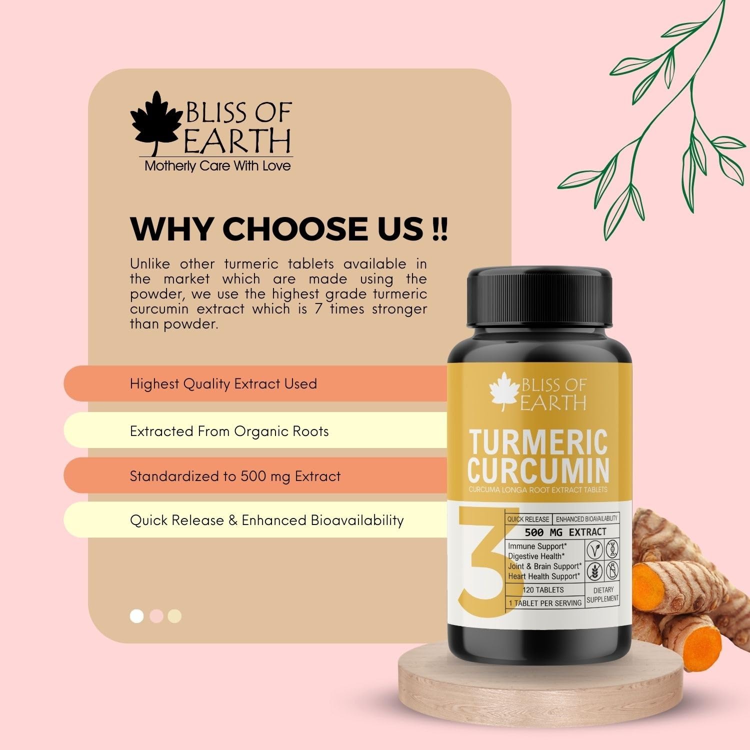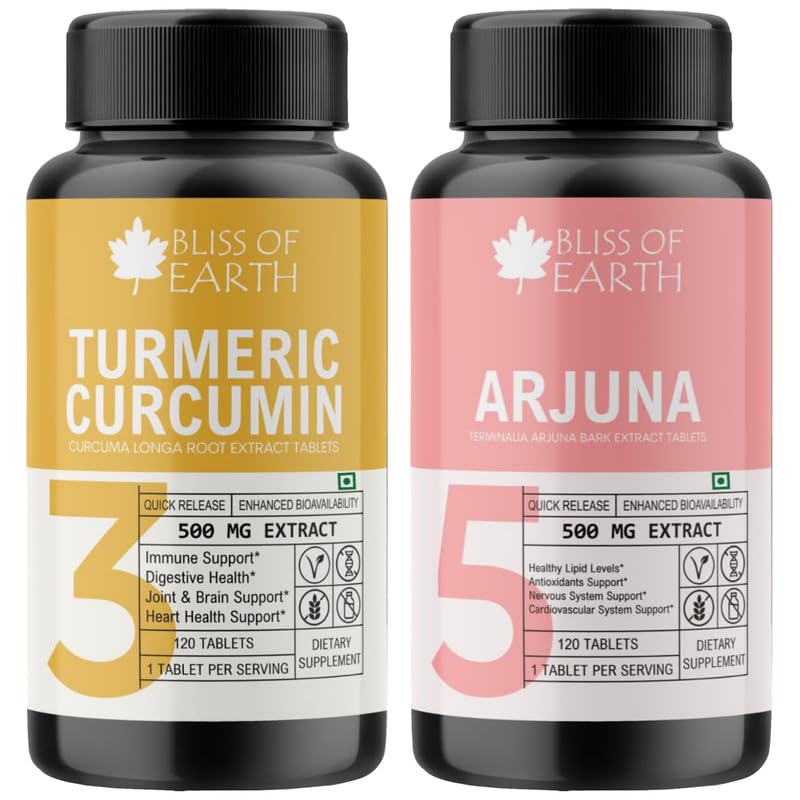 Unlock the power of nature with Bliss of Earth Turmeric Curcumin 500mg tablets a natural supplement designed to promote joint health and support a healthy inflammatory response. These tablets feature a potent dose of curcumin the active compound found in turmeric renowned for its potential health benefits. Experience the quick release and enhanced bioavailability for maximum effectiveness. & Bliss of Earth Arjuna scientifically known as Terminalia arjuna is a revered herbal supplement celebrated for its potential cardiovascular benefits. These Arjuna tablets offer a convenient and standardized way to incorporate the natural goodness of this traditional Ayurvedic herb into your daily wellness regimen.