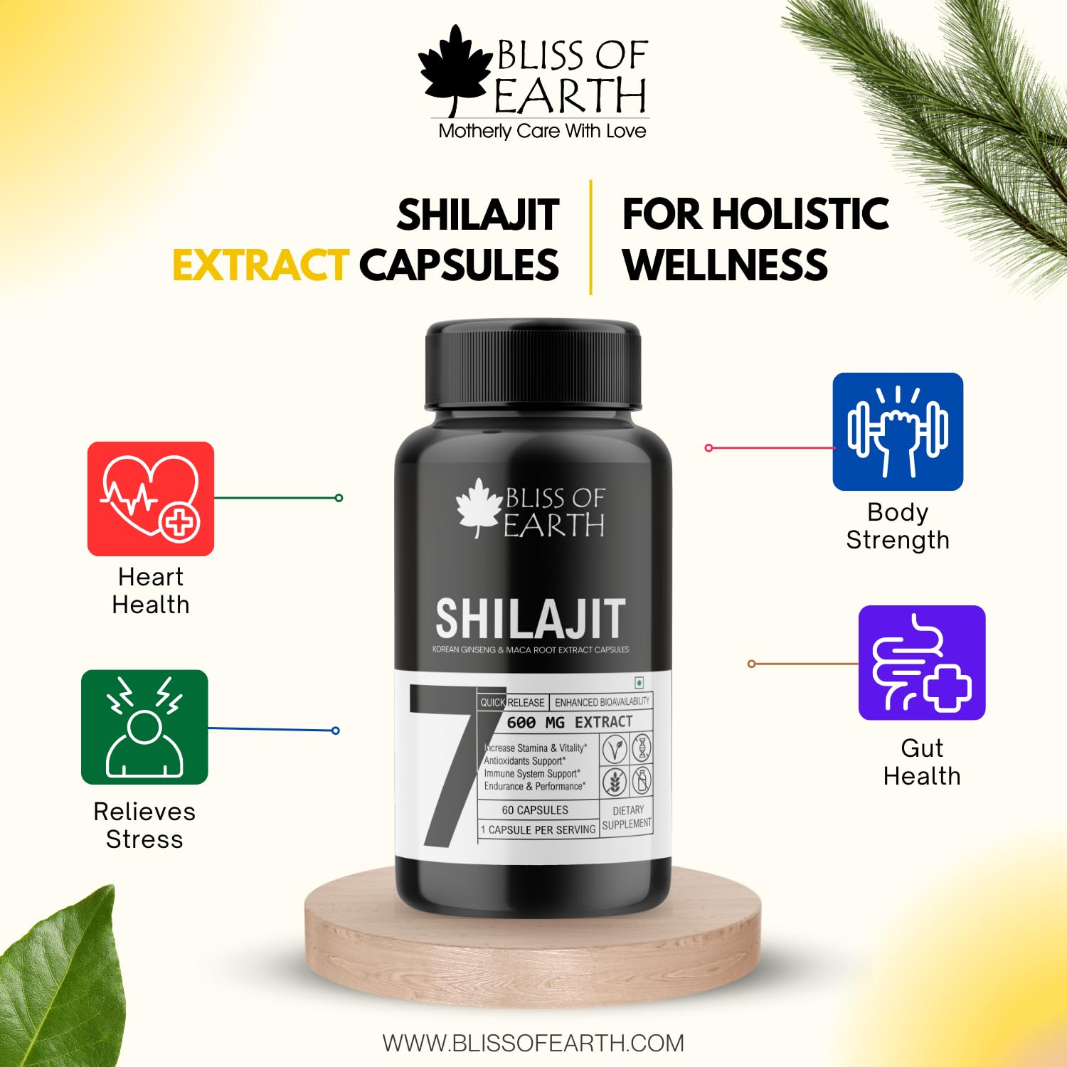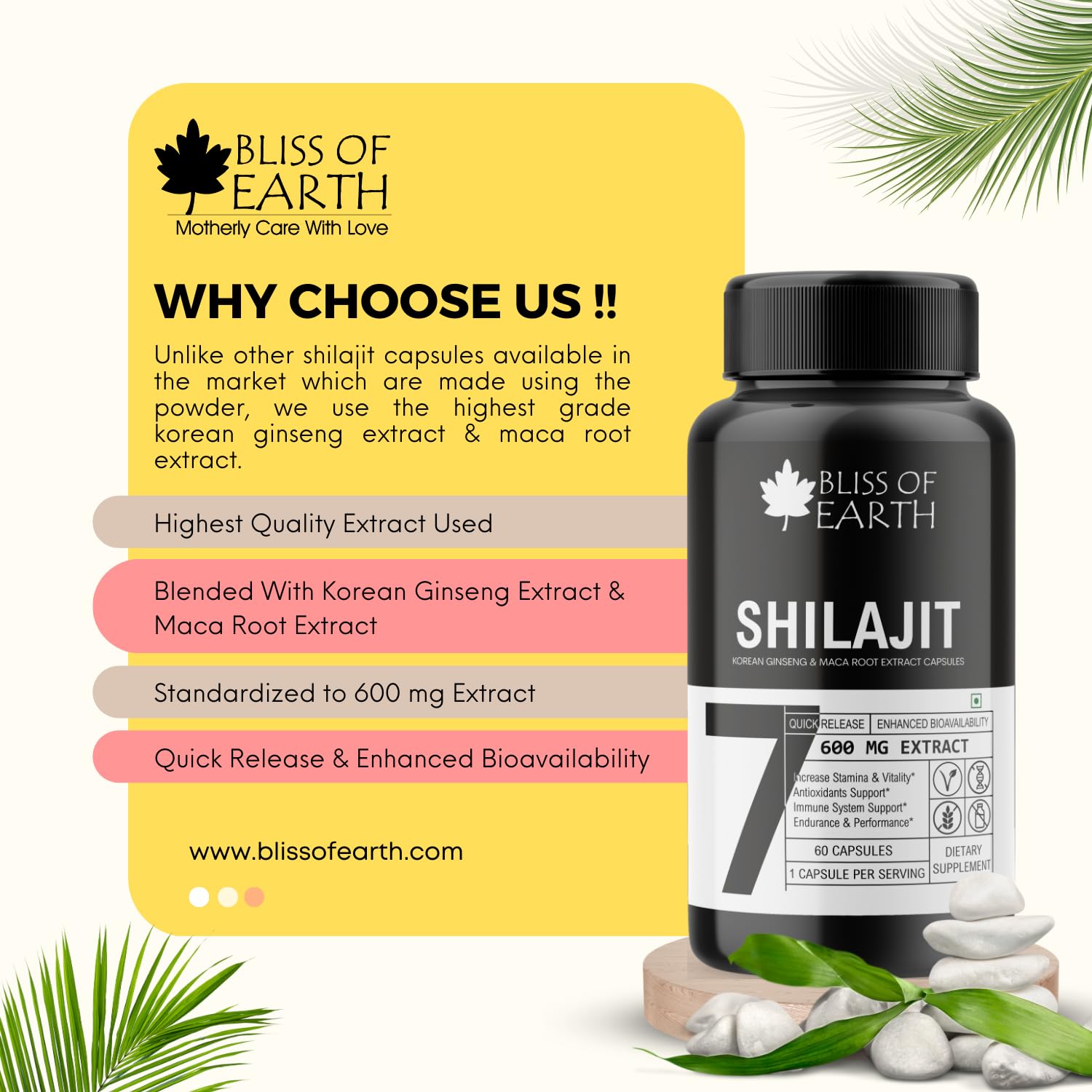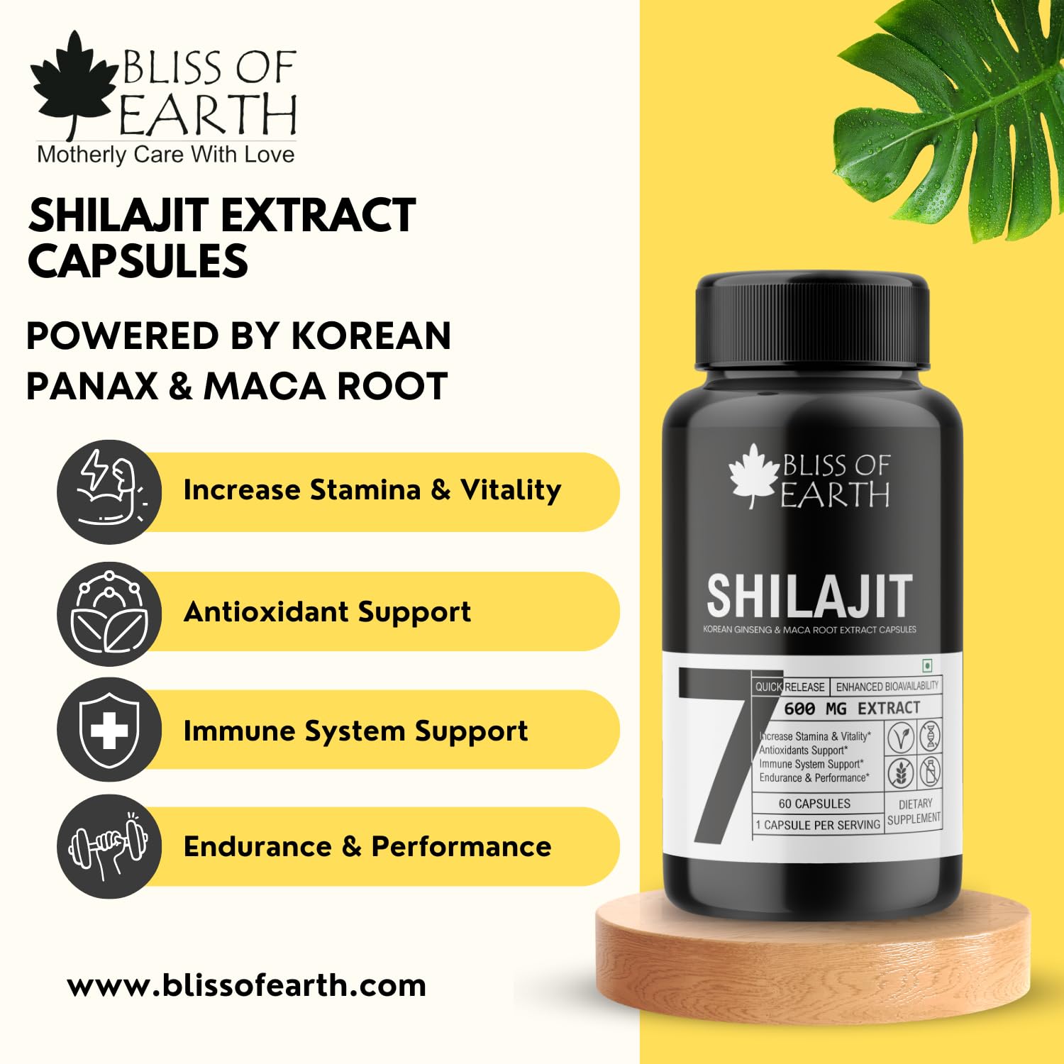 Bliss of Earth Himalayan Shilajit Extract Capsules For Men & Women With Korean Red Panax Ginseng & Maca Root Extract 60 Veg Capsules 600mg High Potency Extract Supplement