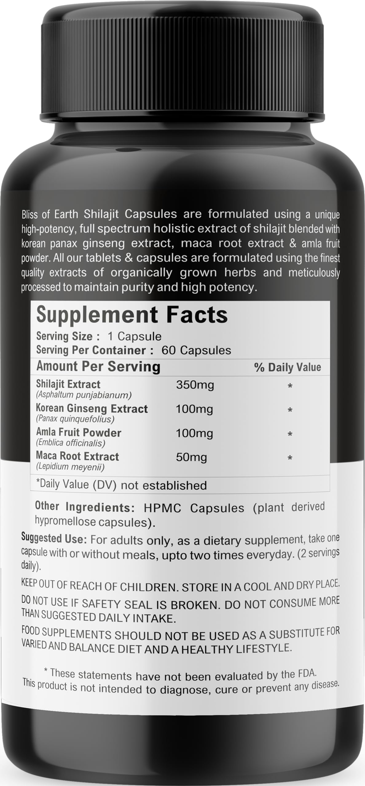 • HIGH POTANCY SHILAJIT SUPPLEMENT: Bliss of Earth shilajit capsules are formulated using the high potency extract of Himalayan shilajit resin and blended with Korean panax ginseng extract and maca root extract that passes through stringent potency and puri