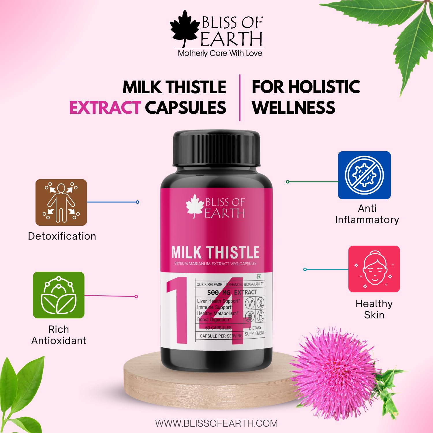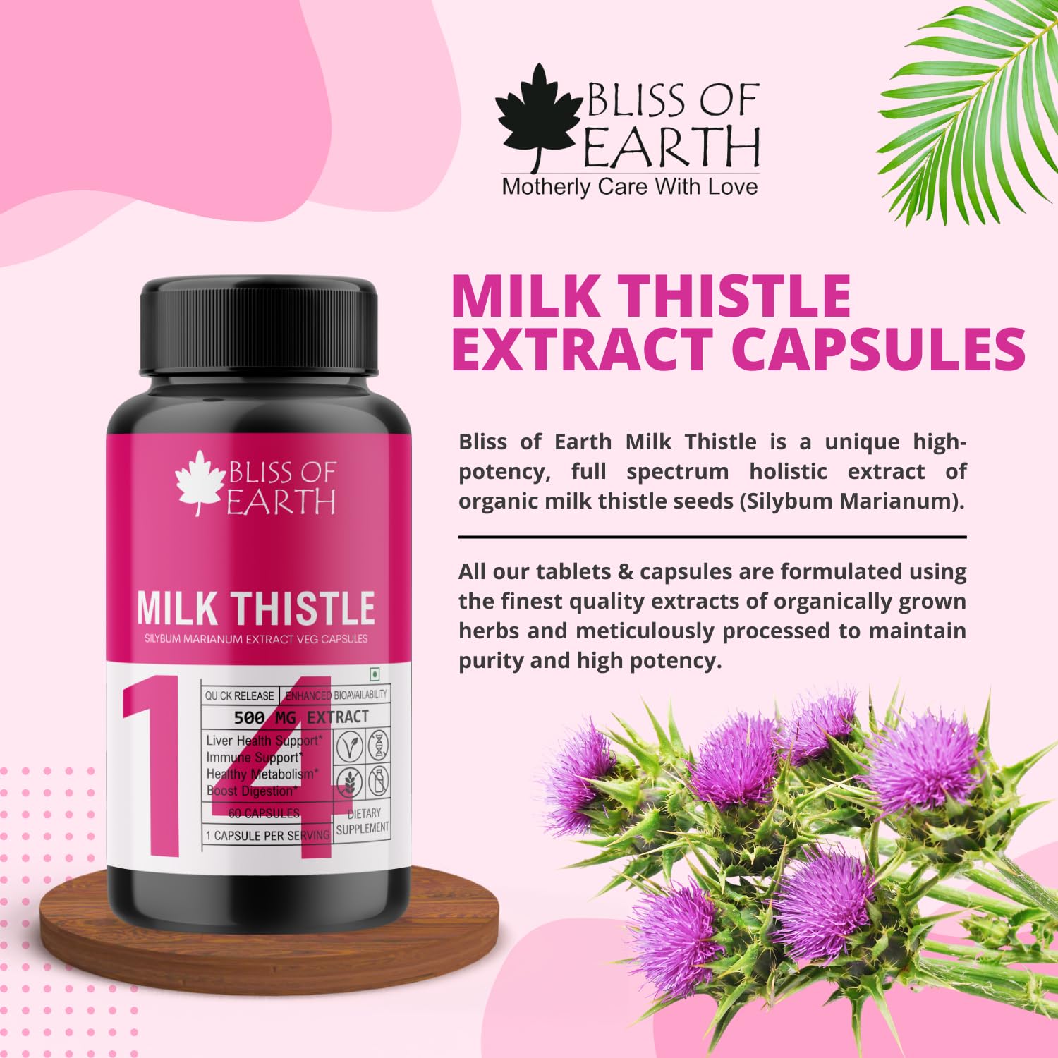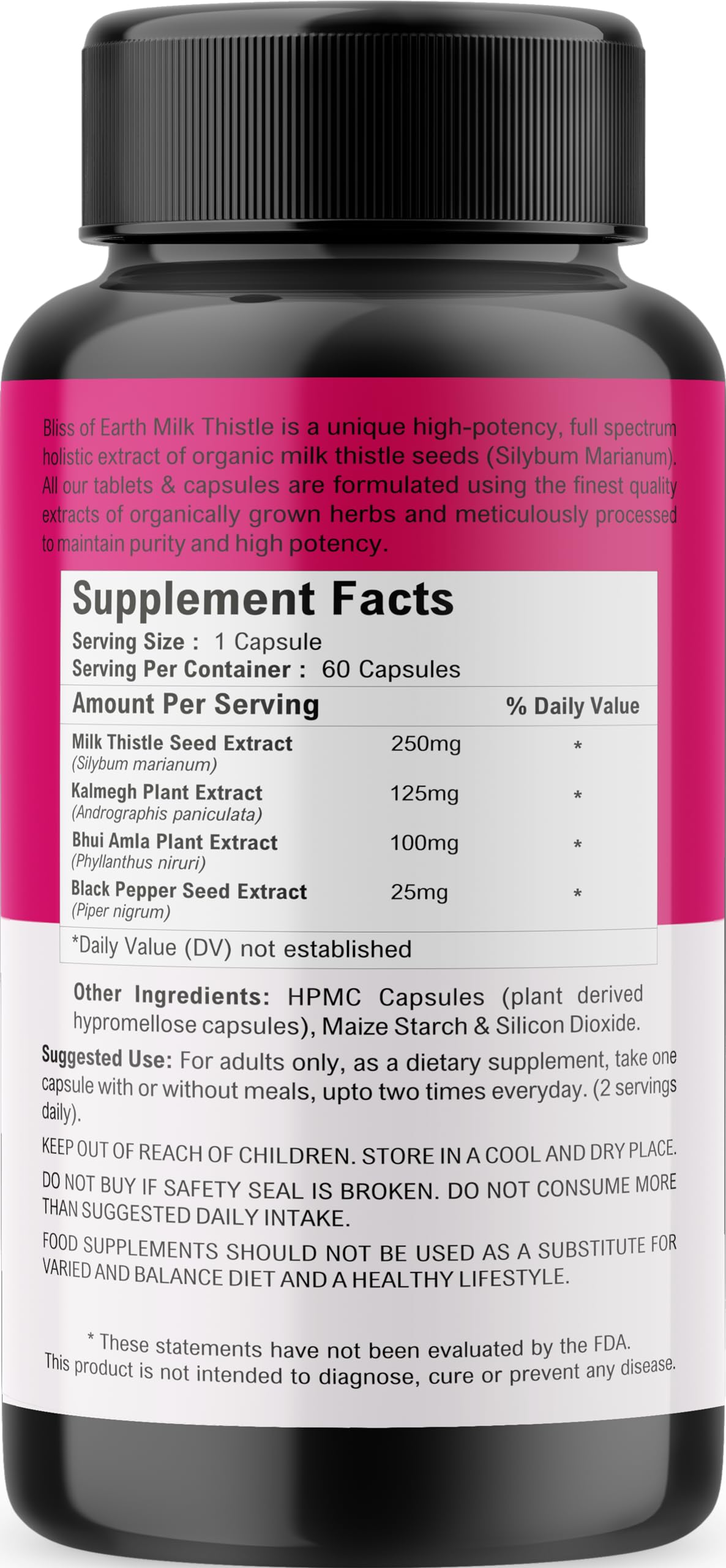 Liver Detox Powerhouse Experience the ultimate liver support with Bliss of Earth's Milk Thistle Extract Capsules. These capsules promote liver health and aid in detoxification helping you feel rejuvenated and energized. Packed with antioxidants it shields the liver from free radical damage and supports natural detox processes. Nature's Finest Formula Harness the power of 80% silymarin the active ingredient in milk thistle encapsulated in each serving. Bliss of Earth's Milk Thistle Extract Capsules are non-GMO gluten-free and made with pure high-quality ingredients for a reliable and effective liver cleanse. Elevate your wellness journey and give your liver the care it deserves today.