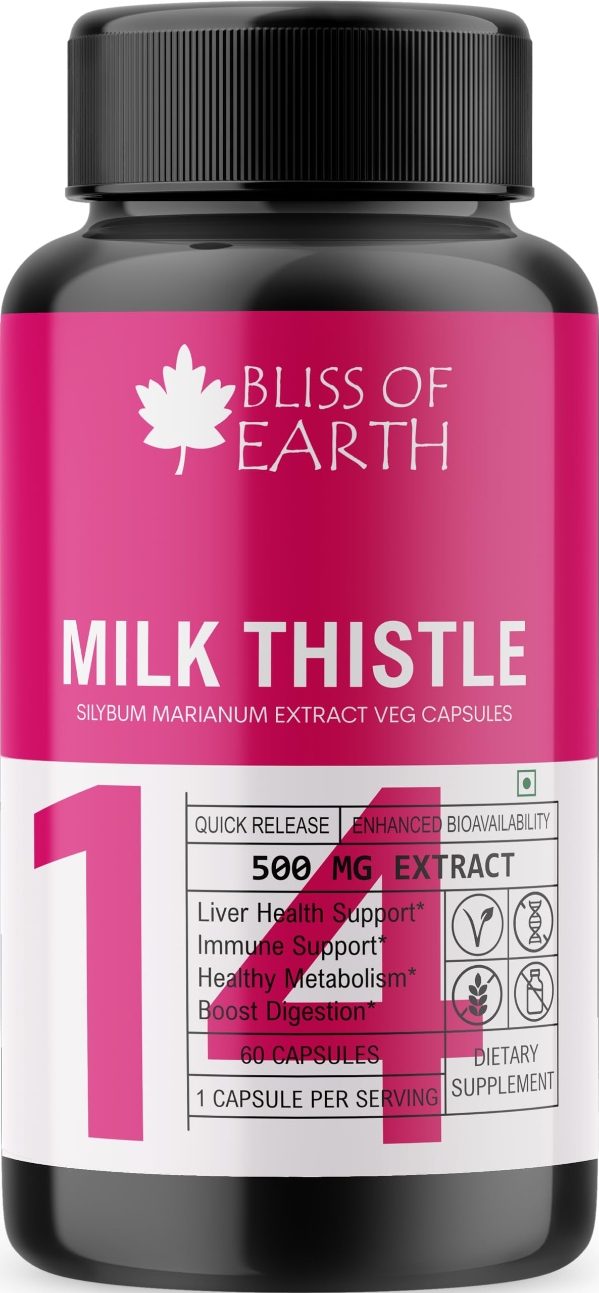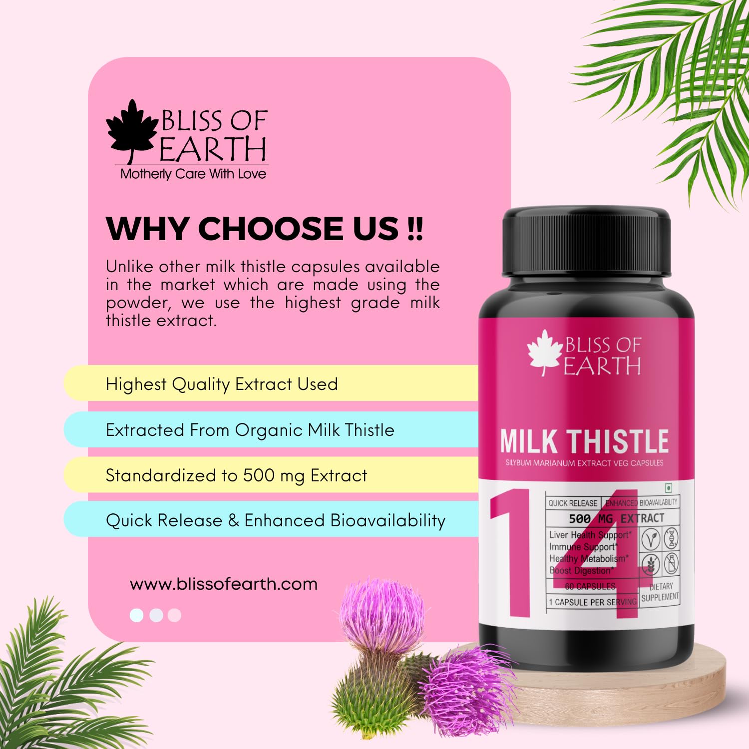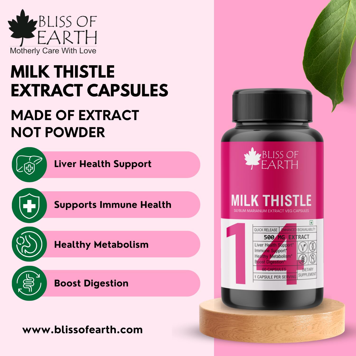 Liver Detox Powerhouse Experience the ultimate liver support with Bliss of Earth's Milk Thistle Extract Capsules. These capsules promote liver health and aid in detoxification helping you feel rejuvenated and energized. Packed with antioxidants it shields the liver from free radical damage and supports natural detox processes. Nature's Finest Formula Harness the power of 80% silymarin the active ingredient in milk thistle encapsulated in each serving. Bliss of Earth's Milk Thistle Extract Capsules are non-GMO gluten-free and made with pure high-quality ingredients for a reliable and effective liver cleanse. Elevate your wellness journey and give your liver the care it deserves today.