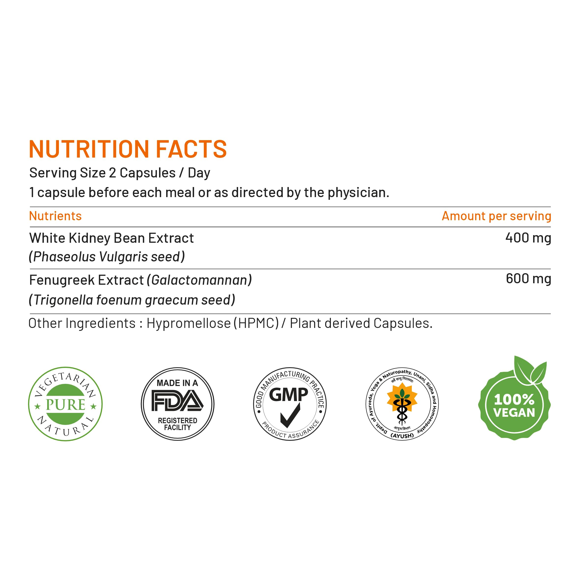 NATURAL BLOOD SUGAR MANAGEMENT : Fenugreek Extract contains strong dietary fibers that promote Gut Health and also helps delay Sugar Absorption. White Kidney Bean Extract Carb Blocker supports inhibition of Carbohydrate Absorption in the body therefore he