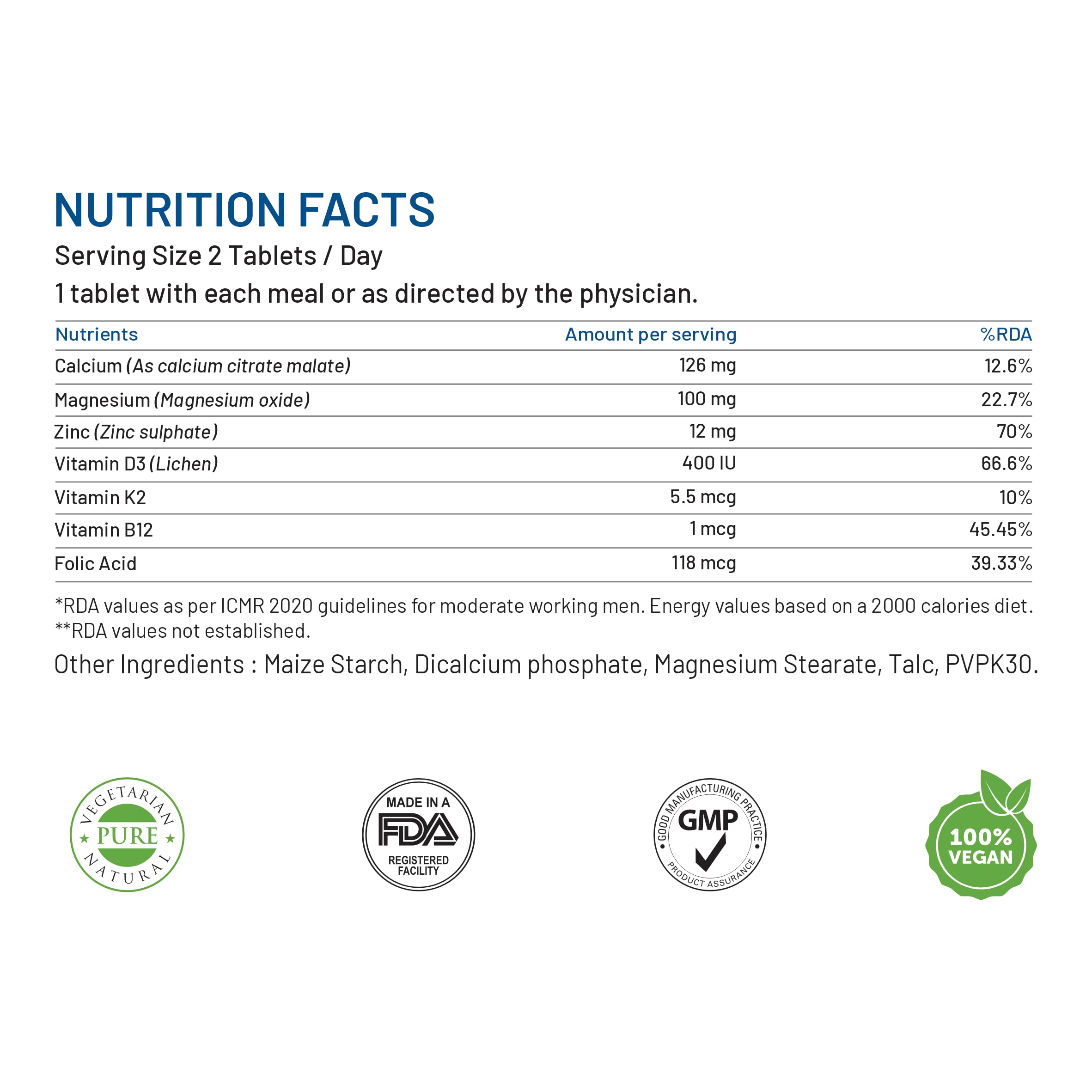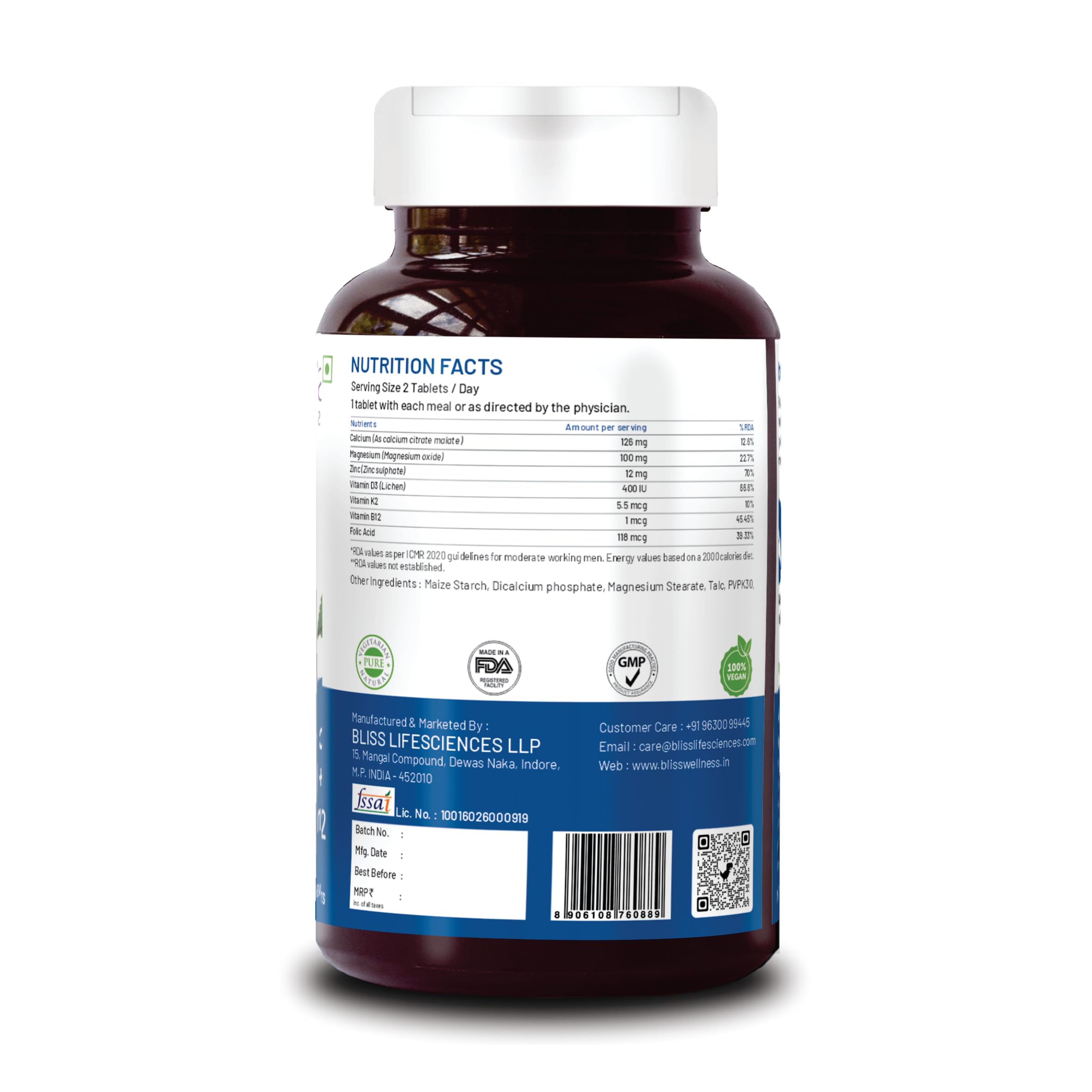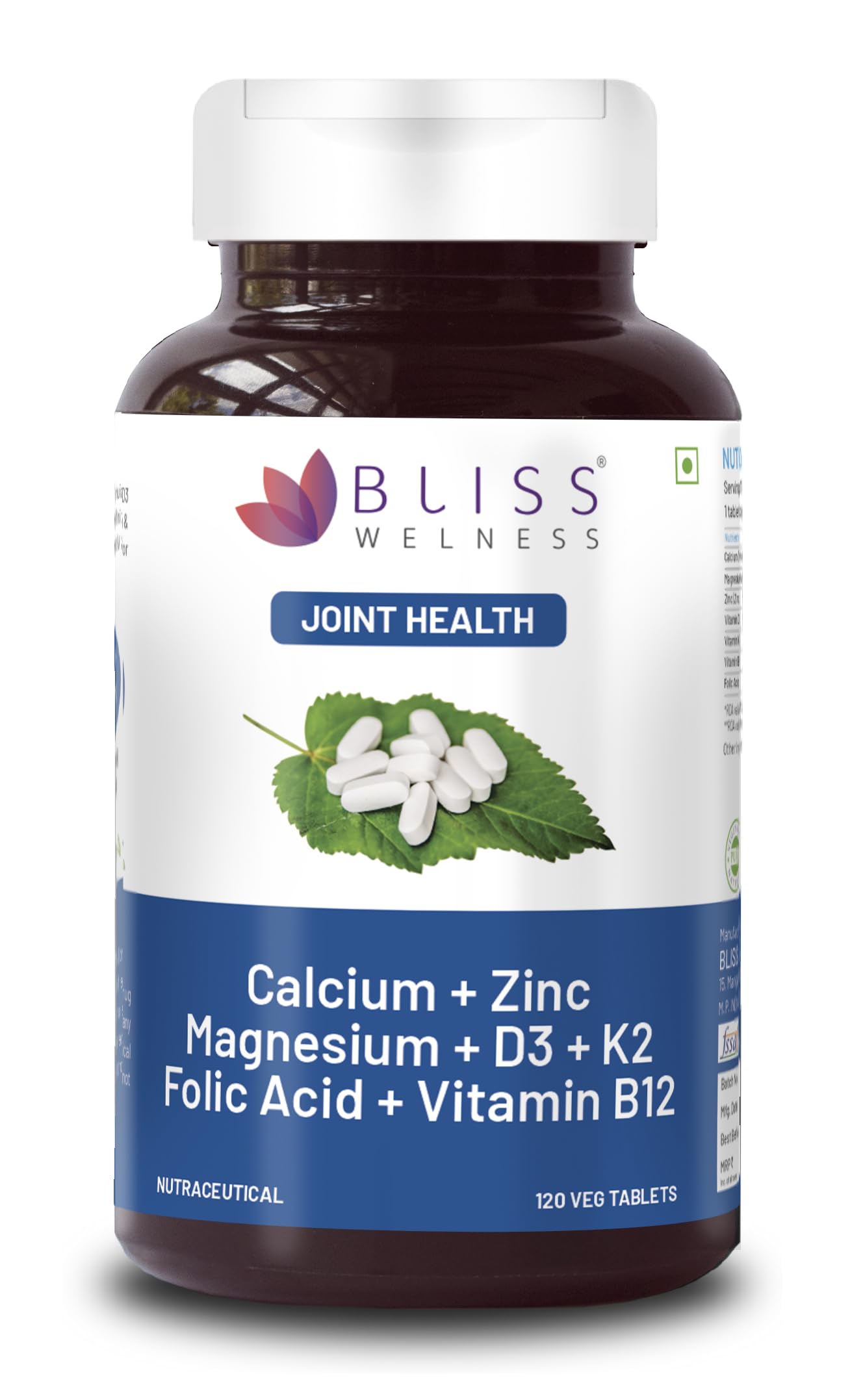 Bliss Welness Calcium Magnesium Zinc Vitamin D3 K2 & B12 Folic Acid | Joint Support Bone Strength Pain Relief Ortho Care | For Men & Women Health Supplement - 120 Vegetarian Tablets.
