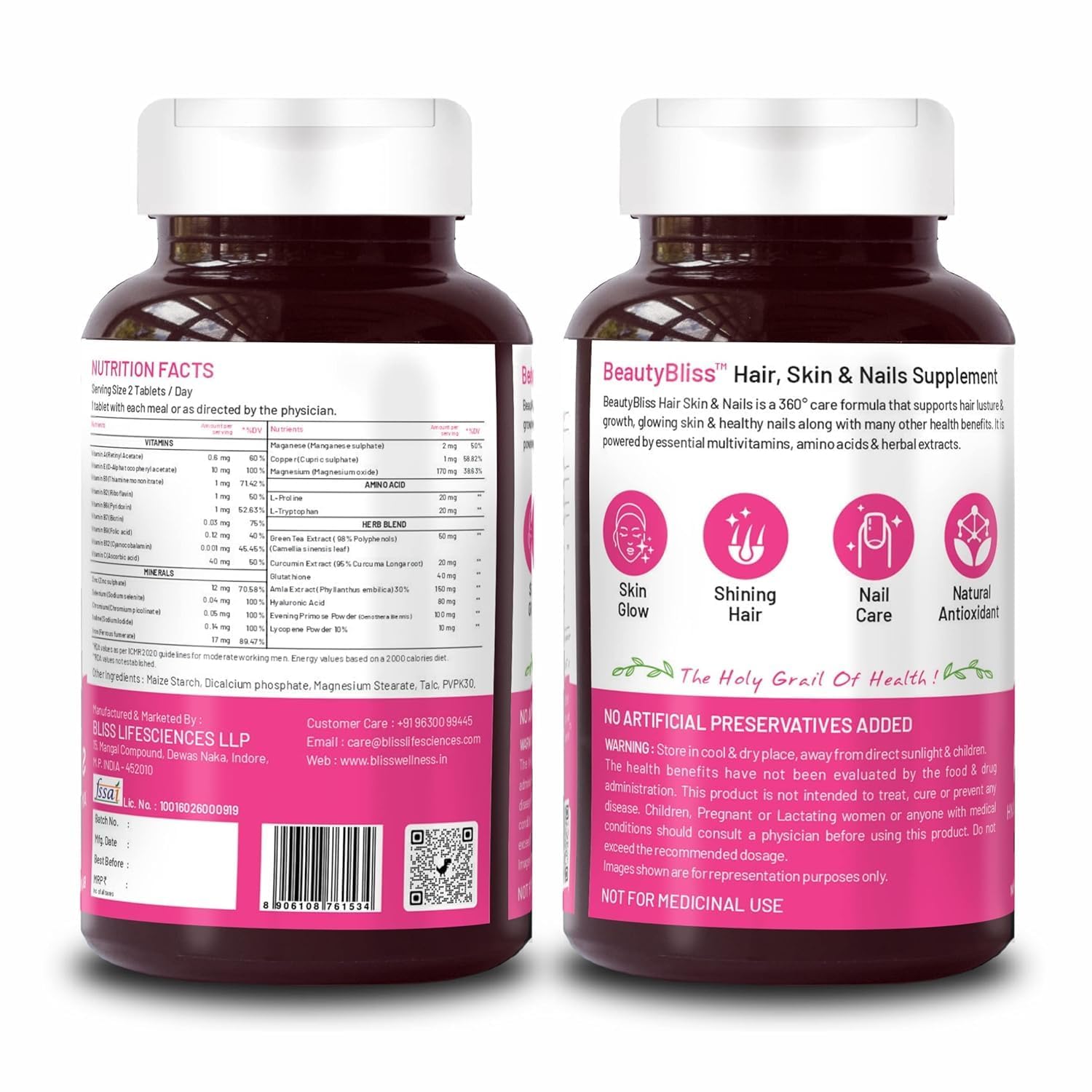 PREMIUM HAIR SKIN NAIL MULTI VITAMIN COMBO : Bliss Welness Hair Skin & Nail Multivitamins Supplement contains premium combo of active ingredients like Hyaluronic Acid Glutathione Biotin Green Tea Extract Curcumin Extract Vitamin A E B1 B2 B6 B7 B9 B12 C m