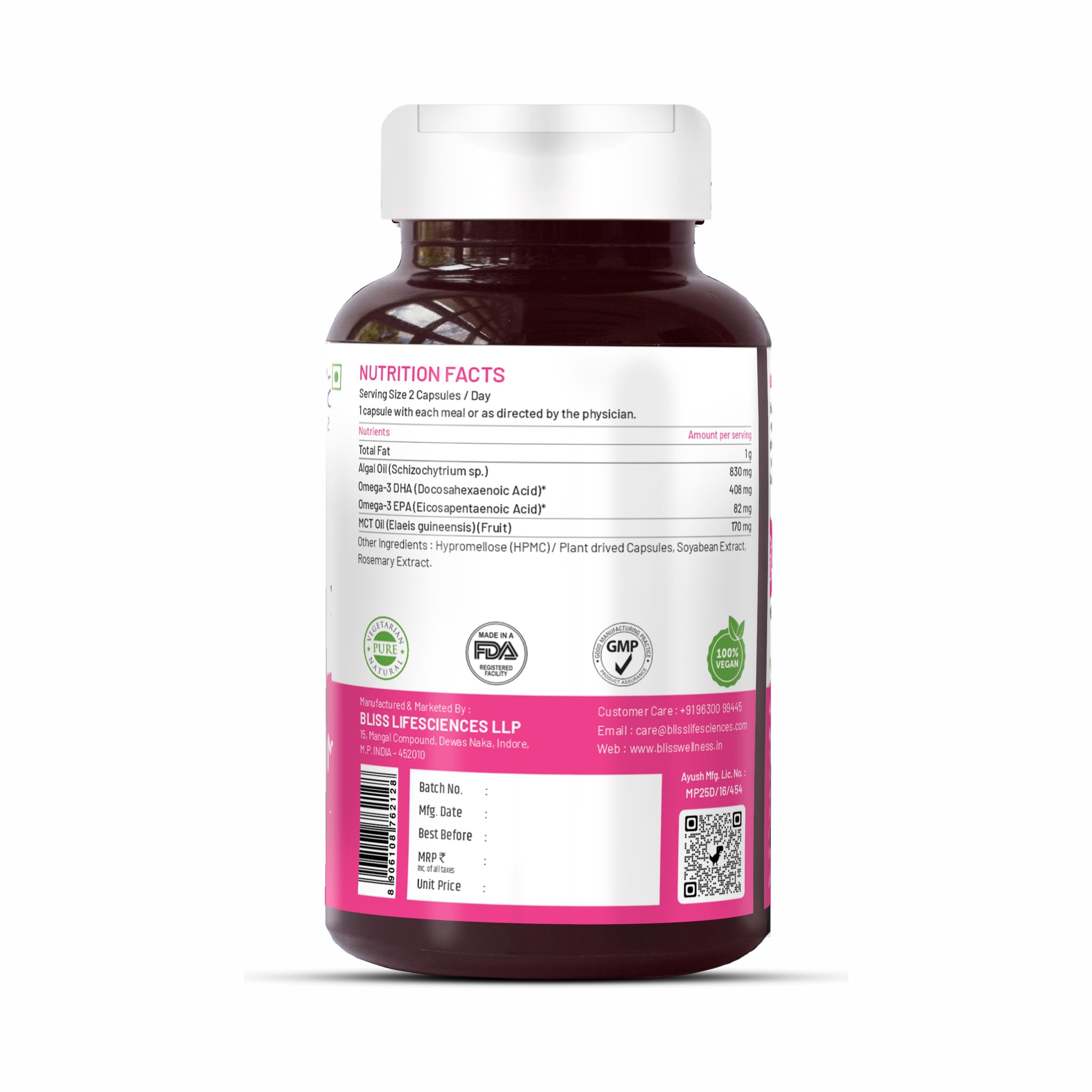 Sustainable Omega-3 Source: Bliss Welness Vegan Omega 3 DHA (Docosahexaenoic Acid) EPA(Eicosapentaenoic Acid) MCT (Medium Chain Triglycerides) oil vegetarian capsules are derived from algae oil This unique blend not only supports brain and heart health bu