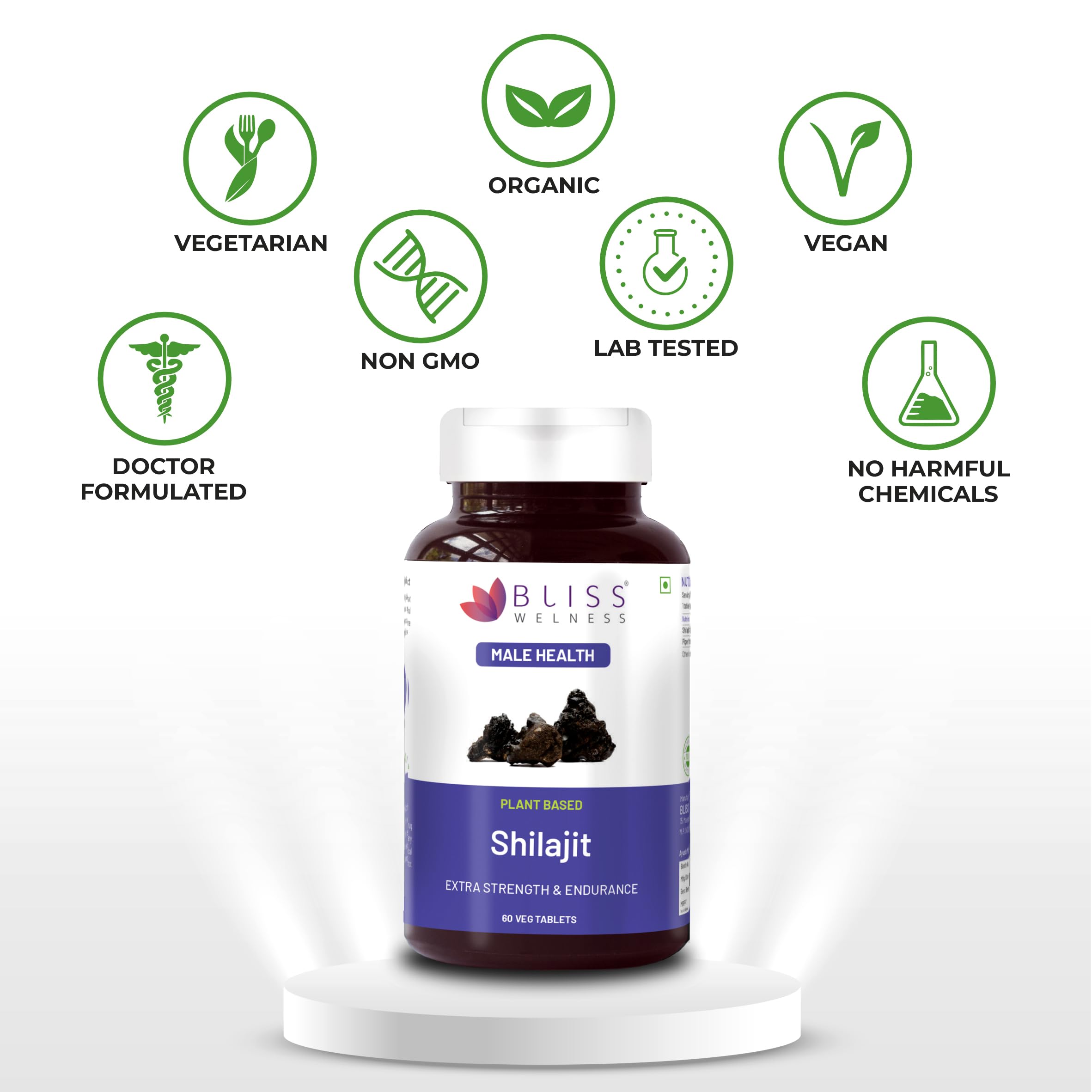 Bliss Welness Pure Himalayan Shilajit Extract | Shuddh Shilajeet 1000mg | Enhanced Stamina Power Strength Vitality Vigor & Endurance Performance Booster Ayurvedic Herbal Supplement - 60 Veg Tablets