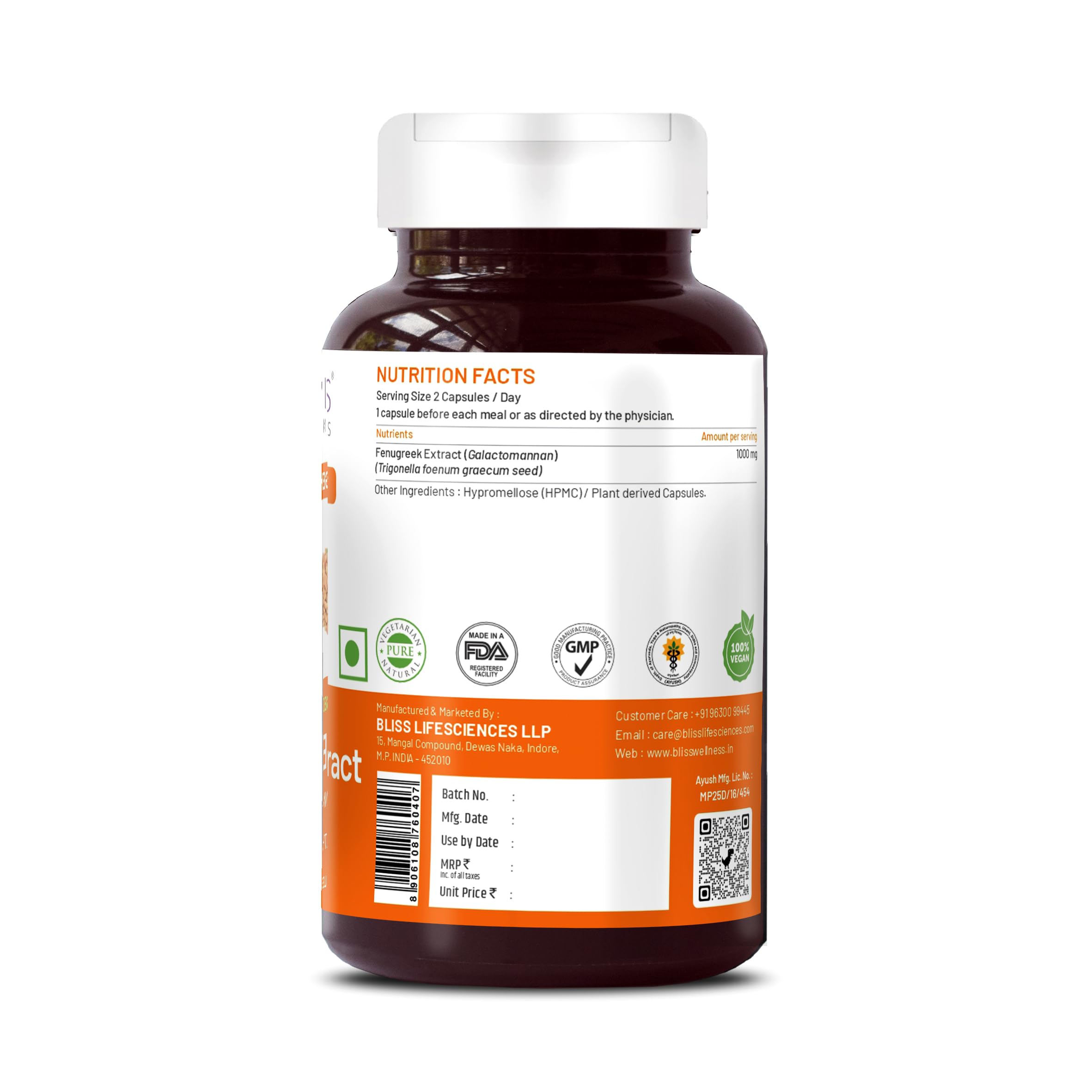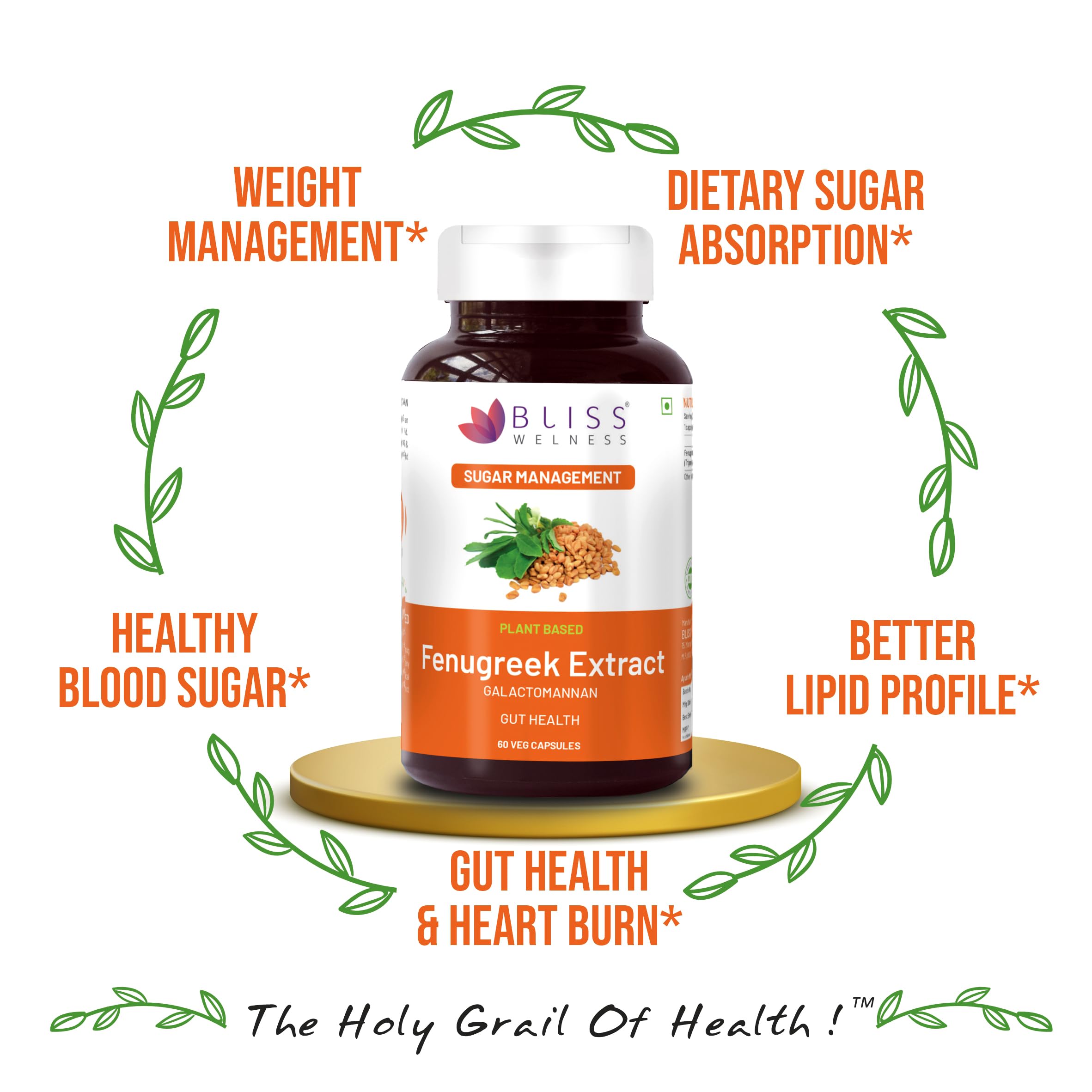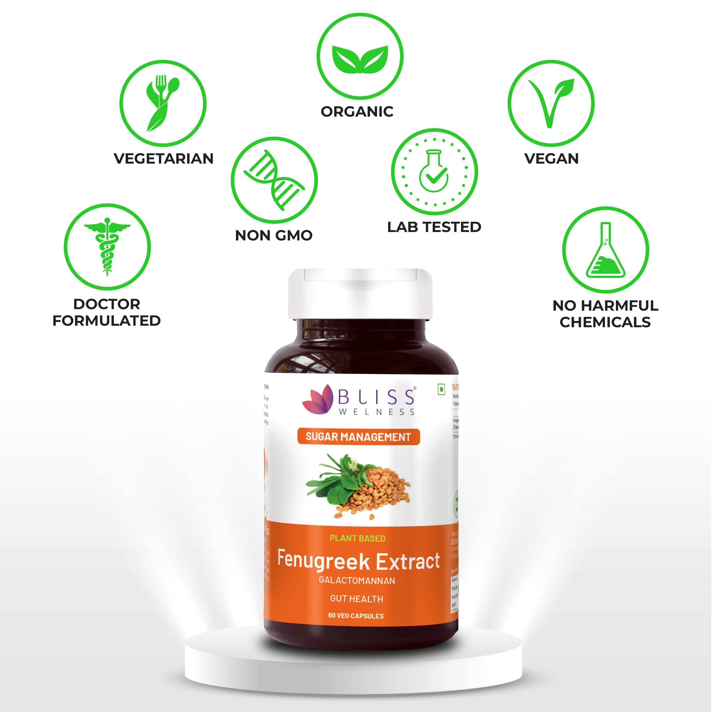 Bliss Welness Pure Sugar & Weight Management | Fenugreek Seed Extract 1000mg Galactomannan Fiber | Gut Metabolism Health Supplement - 60 Vegetarian Capsules