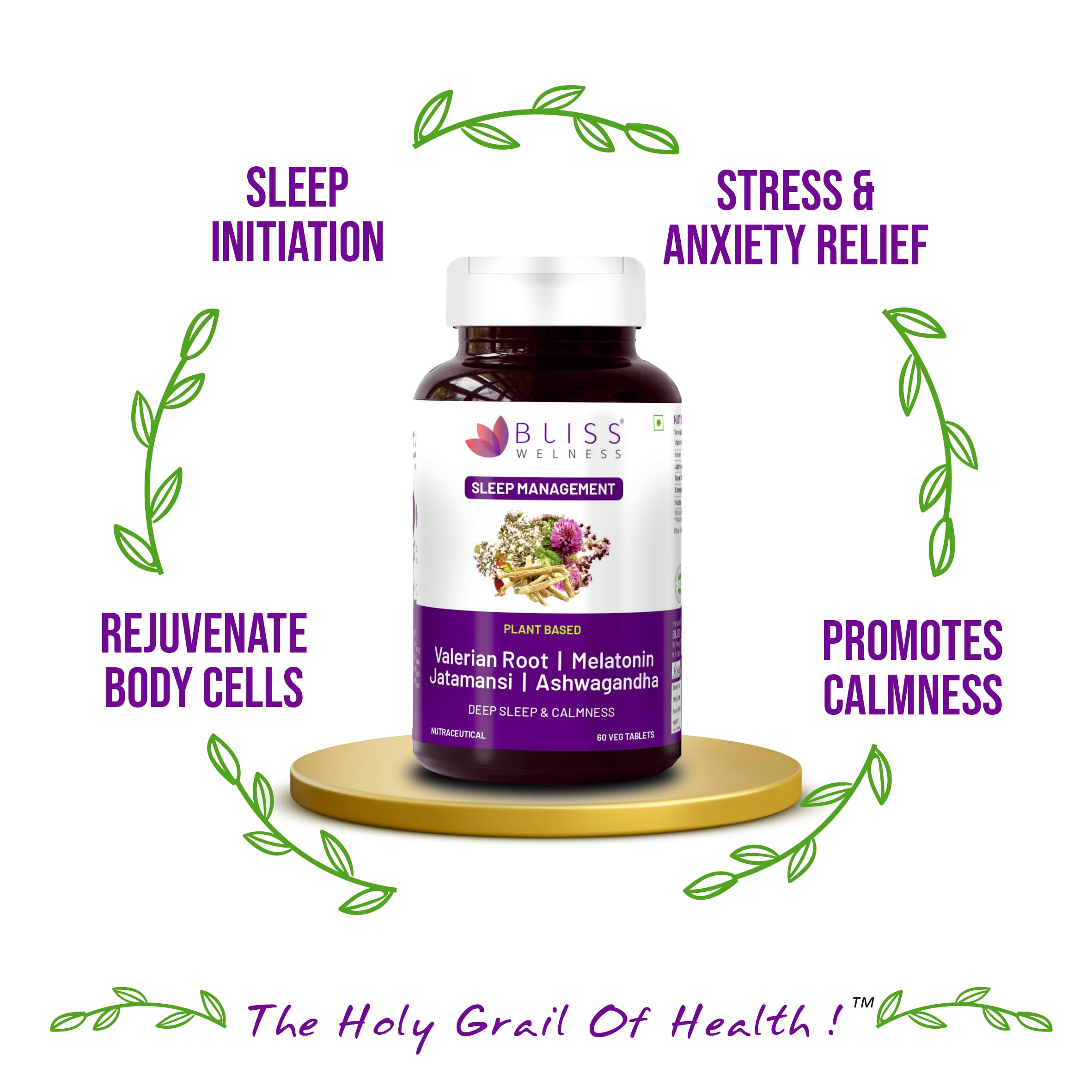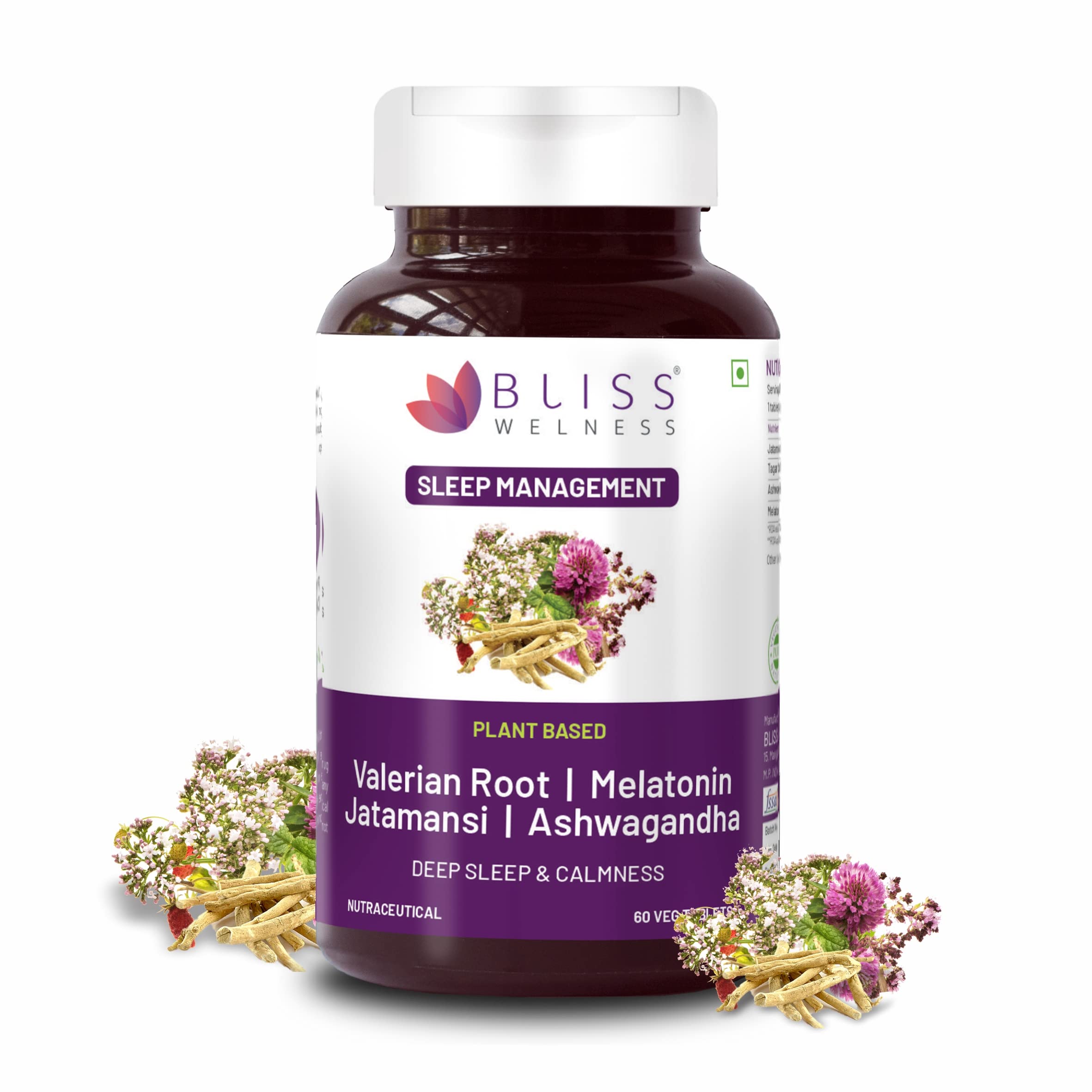 Bliss Welness Sleep Management Valerian Root Melatonin 5 mg Jatamansi Ashwagandha | For Good Sleep Cycle | Stress & Anxiety Relief Health Supplement - 60 Veg Tablets