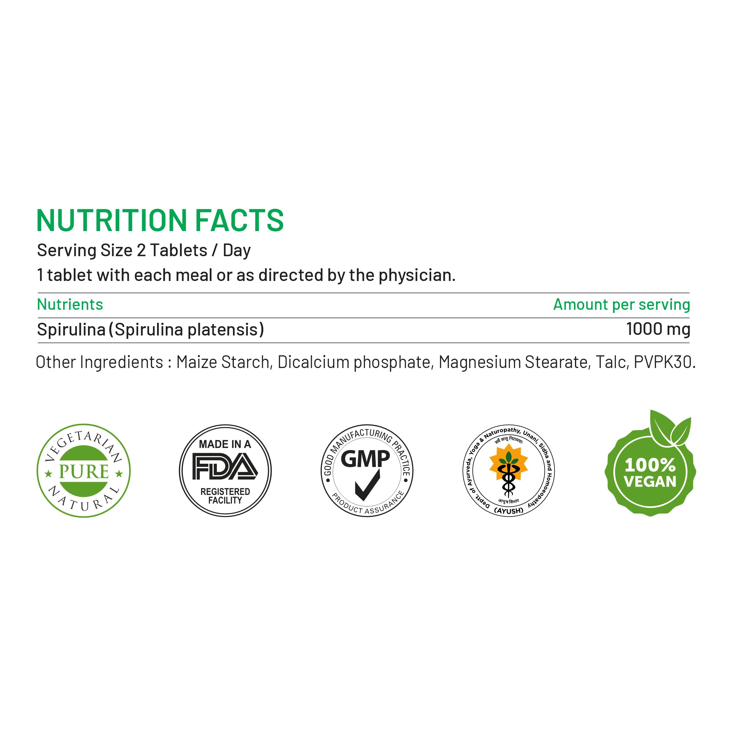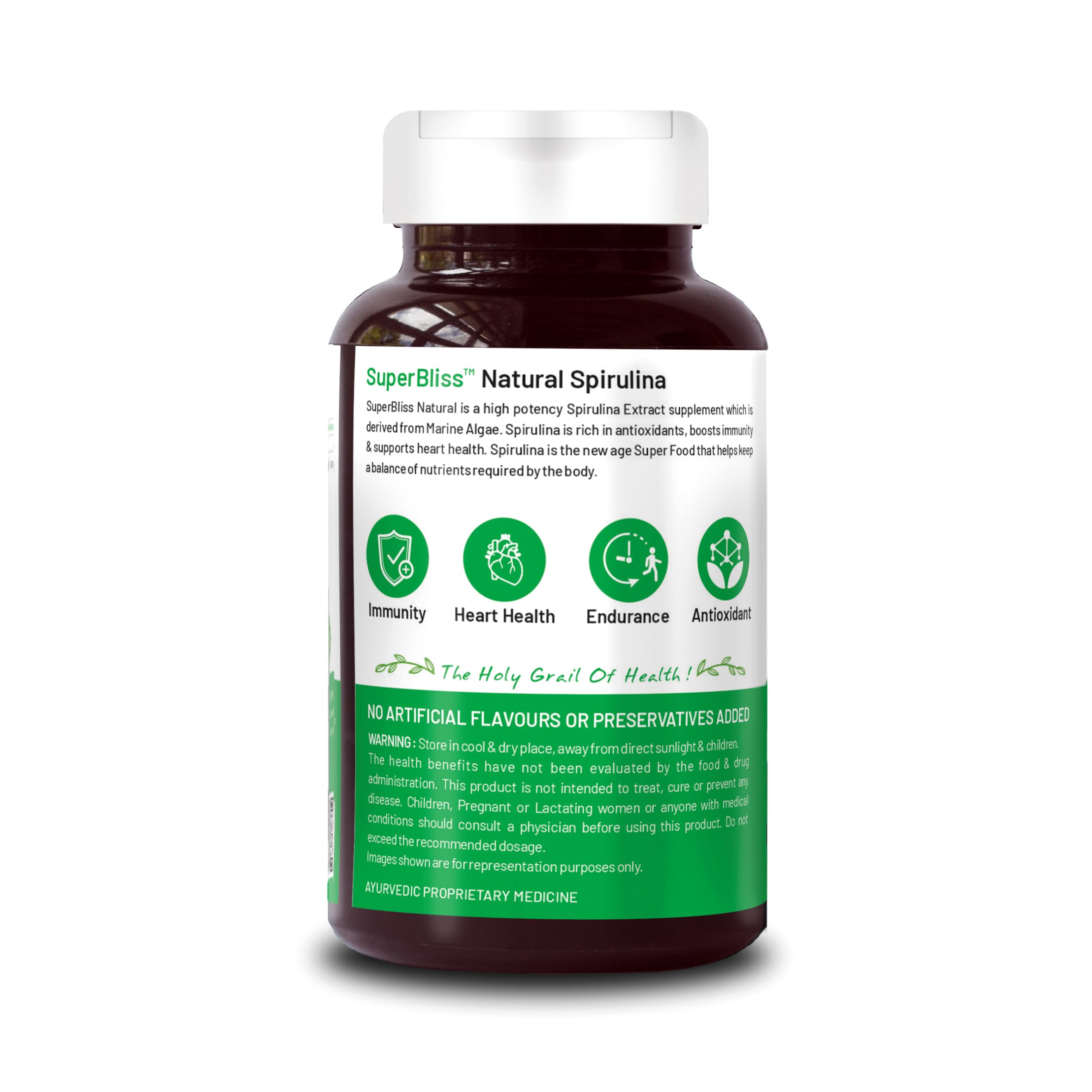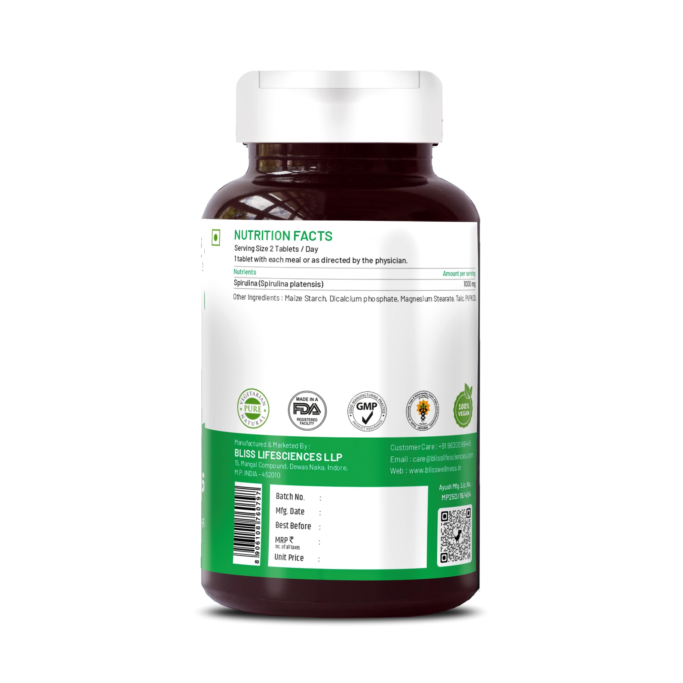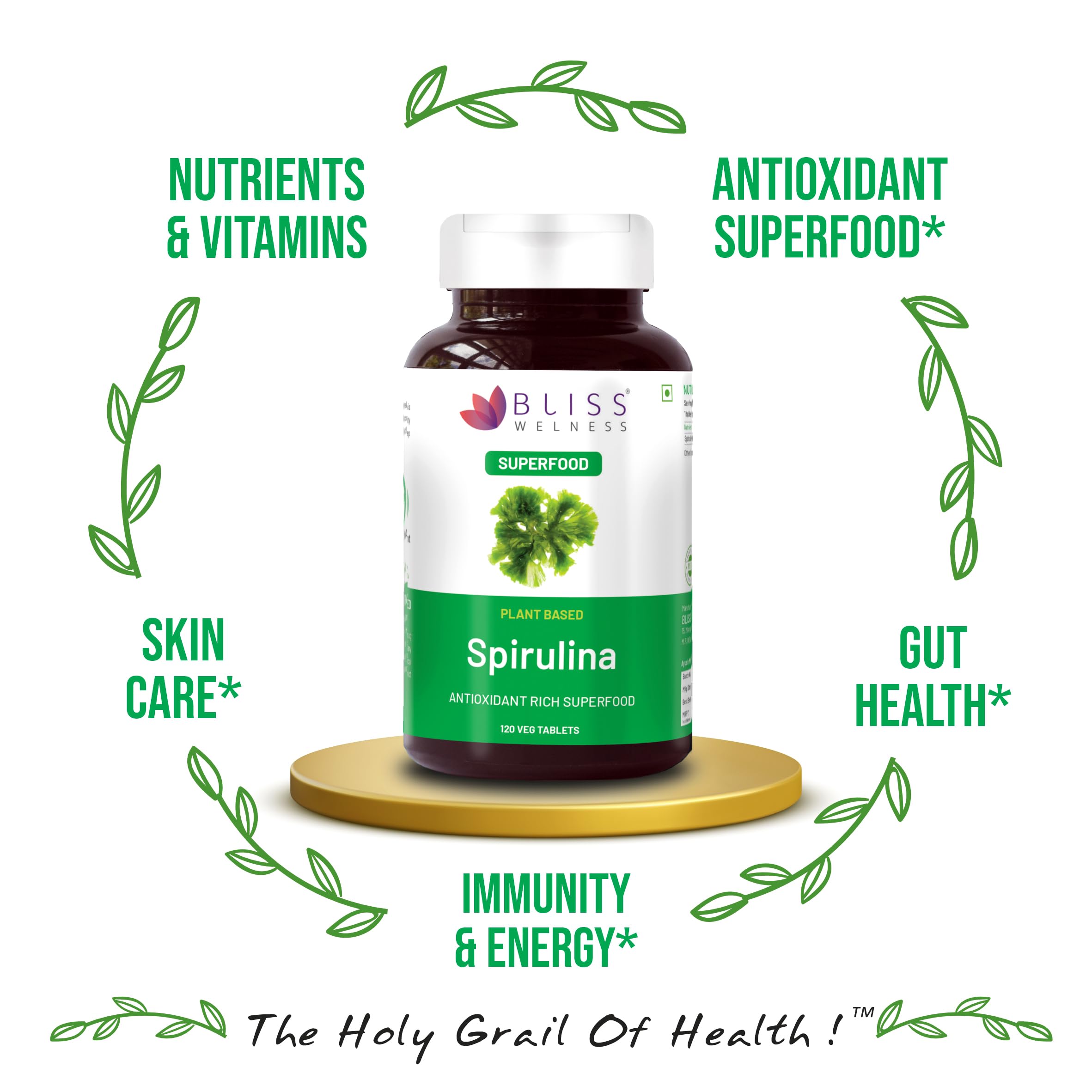 Bliss Welness Spirulina 1000 MG Daily Superfood Immunity Booster with Rich Antioxidant High Energy Detox Vegetarian Health Supplement - 120 Tablets