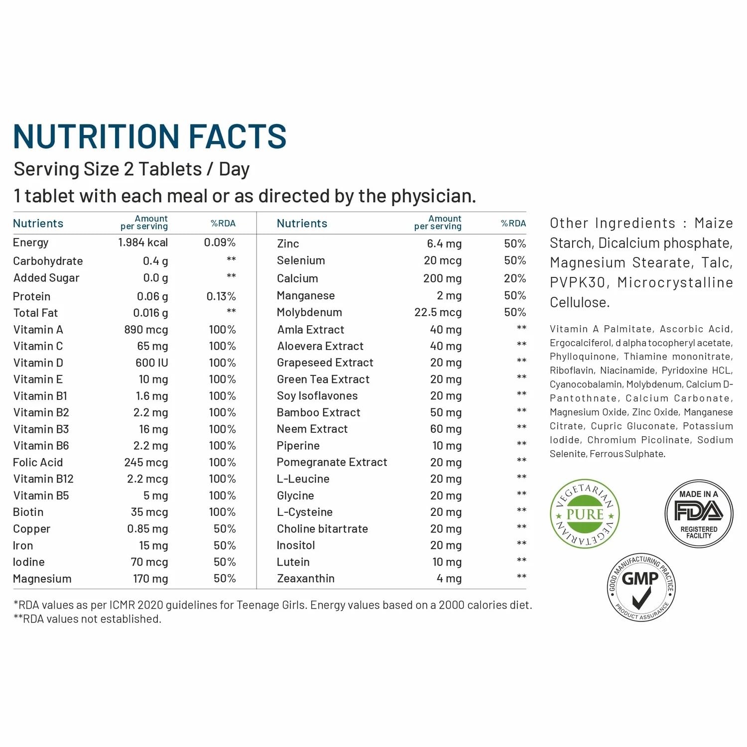 Bliss Welness Teenage Girl Multivitamin With Vitamin Minerals Calcium Magnesium Zinc Aloe Vera Extract Bamboo and Grapeseed Extract For Immunity Hair Skin Nails Bone & Joint Health - 60 Tablets