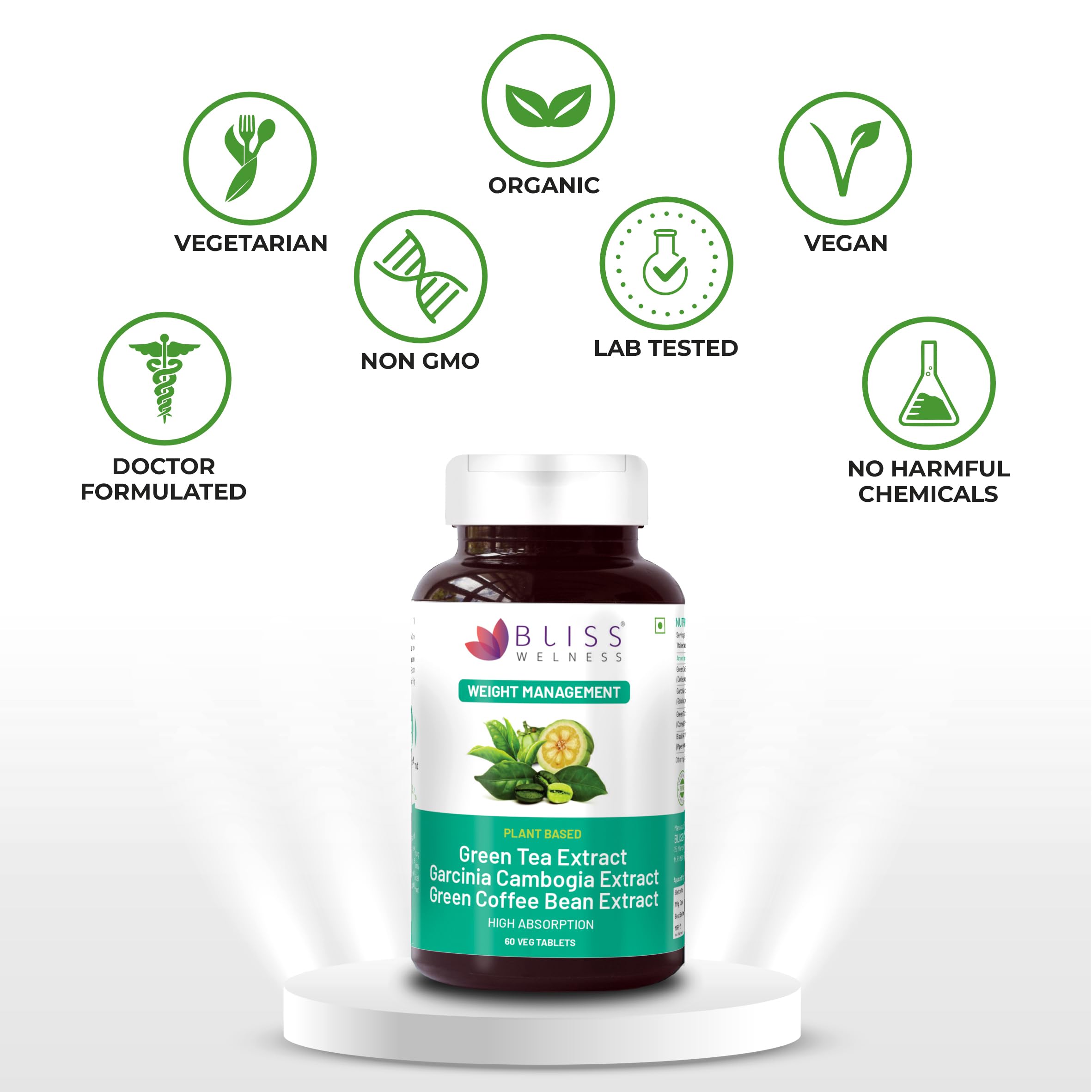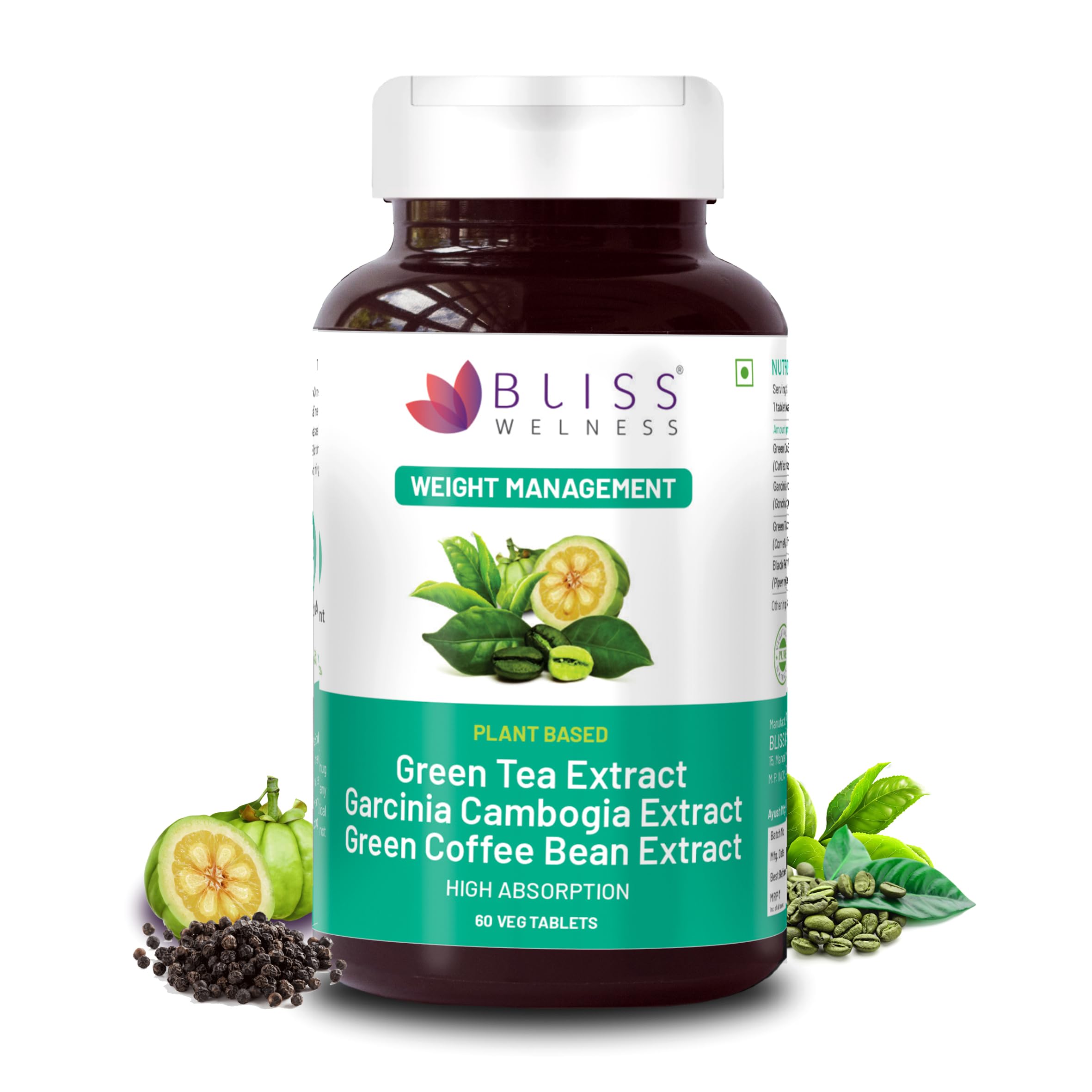 Bliss Welness Weight Management Combo | Green Tea Extract + Garcinia Cambogia Extract 60% + Green Coffee Bean Extract 50% | Appetite Control Metabolism Antioxidant Fat Management Supplement - 60 Vegetarian Tablets