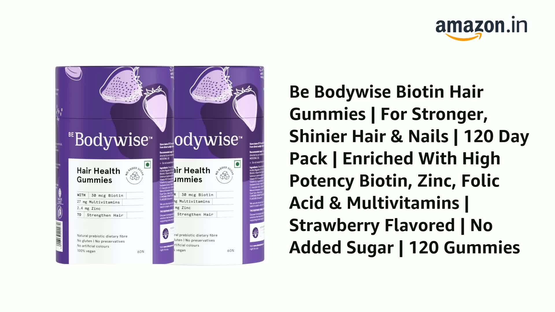 Be Bodywise Biotin Hair Gummies | For Stronger, Shinier Hair & Nails | 120 Day Pack | With Biotin, Zinc, Folic Acid, Fibre & Multivitamin | Strawberry Flavored | No Added Sugar & Gut Friendly