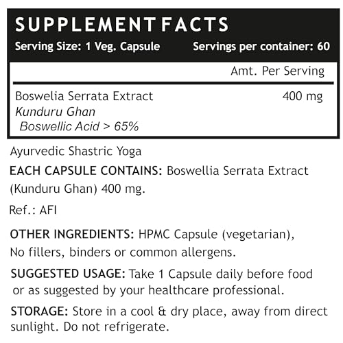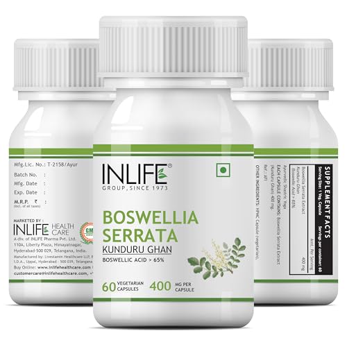 STANDARDIZED TO 65% BOSWELLIC ACID: INLIFE Boswellia Serrata Extract Capsules contain safe natural ingredients and is manufactured to Quality standards. Each vegetarian capsule contains 400 mg of pure Boswellia Serrata extract standardized to 65% Boswellic Acid. INLIFE offers consistent potency in every capsule. THE NATURAL ANTI-INFLAMMATION SUPPORT: Boswellia Serrata or Indian Frankincense is known for its anti-inflammatory properties. Regular use may help to reduce pains related to inflammation like joint pain muscle pain etc. It contains 65% Boswellic acid to deliver powerful relief from achy hips and knees. SUGGESTED USAGE: As a dietary supplement take two (2) capsules together once a day 30 minutes before a meal with a full glass of water or as directed by your healthcare professional. For those with a more sensitive constitution we recommend taking one (1) capsule twice per day 30 minutes before a meal with a full glass of water. PURITY: Our product contains the most natural and effective formulation of trusted natural ingredients that are carefully processed and manufactured in a GMP certified manufacturing facility so you can be sure that you're safe. Vegan and vegetarian friendly-INLIFE Boswellia Serrata extract vegetarian capsules is produced in gluten-free capsules and contains no artificial ingredients.