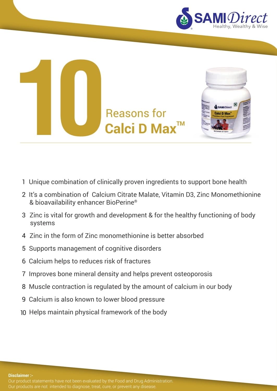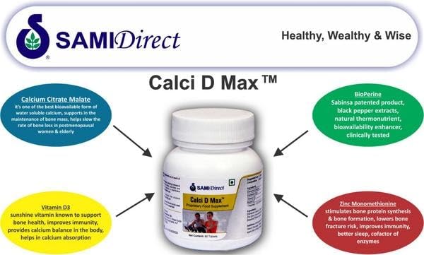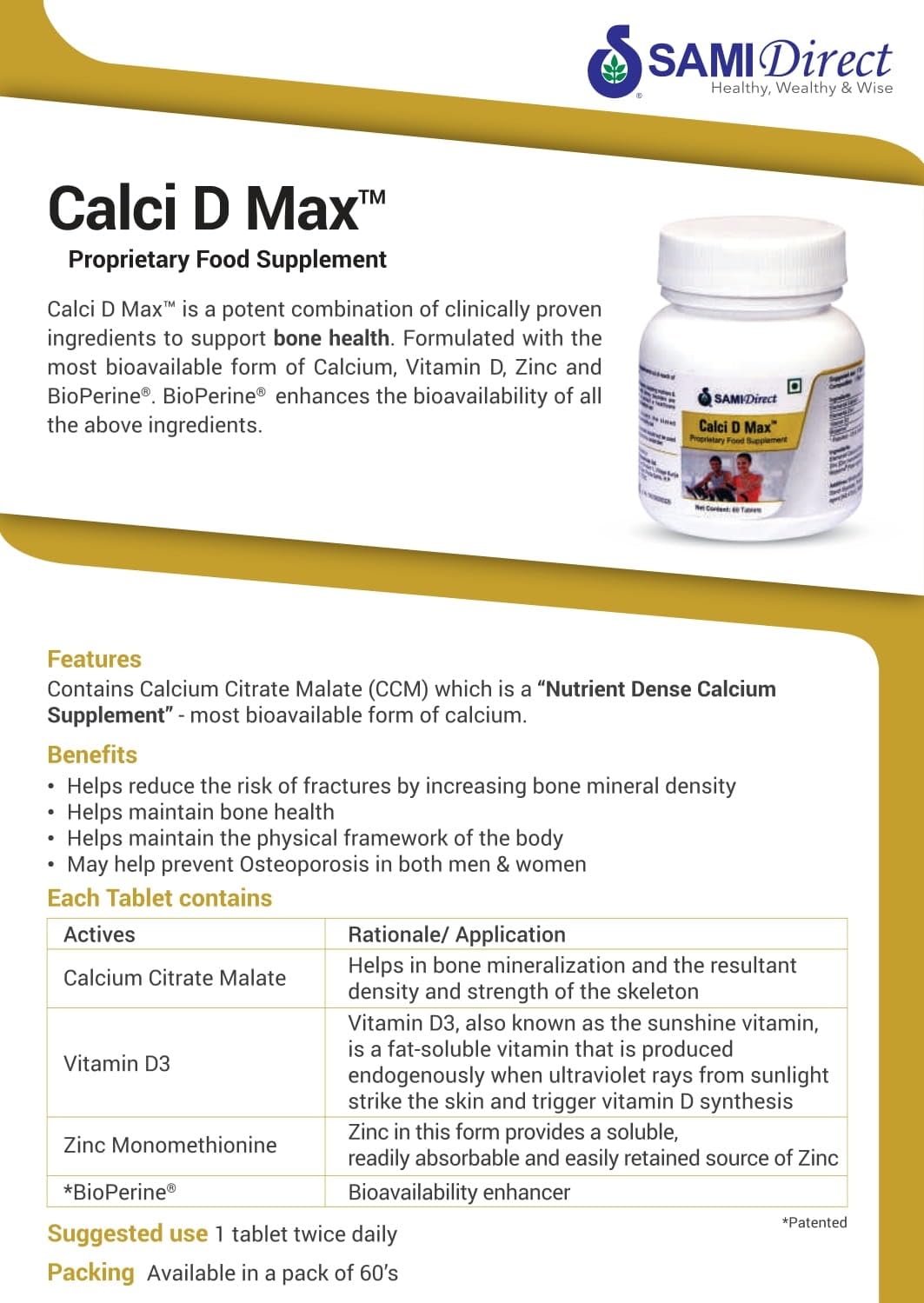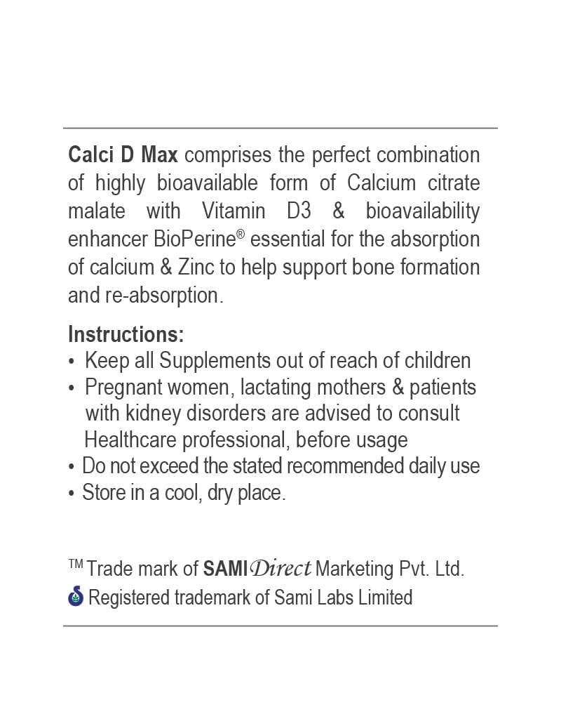 Calci D Max is a potent combination of clinically proven ingredients to support bone health. Formulated with the most bioavailable form of Calcium Vitamin D to optimize the absorption of calcium Zinc to maintain bone density and BioPerine to enhance the bioavailability of all the above this product is effective and essential to improve bone health. Healthy & strong bones can directly be correlated to the overall quality of life. To be active fit and in motion to carry out basic day-to-day activities is preferred across all ages. Bones are rigid organs that constitute part of the endoskeleton which give our body the basic framework and shape. They support and protect various organs of the body produce red and white blood cells and store minerals. It is thus very important to take care of our bones which are fundamental for all regular physical activities. The strength of a bone is determined by both its material composition and structure. Healthy bones need to be stiff and resist deformation and at the same time be flexible to withstand compression and tension without cracking. Health supplements such as those rich in calcium citrate malate (a most bioavailable form of Ca) and other suitable adjuvants taken daily have proven to maintain good bone health.