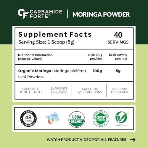Carbamide Forte 100% Organic Moringa Powder - Moringa Oleifera - USDA Certified | Moringa Leaves Powder | Moringa Powder Organic for Immunity, Digestion & Energy | Drumstick Leaves Powder - 200g