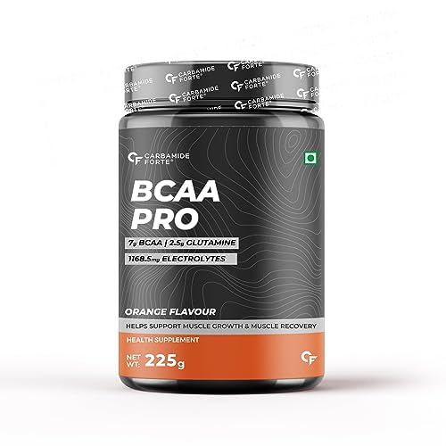 Carbamide Forte BCAA PRO Supplement for Men & Women 15g Serving with L-Glutamine & L-Citrulline|Max Strength BCAA Powder with 1168.5mg Electrolyte Blend & Vitamin B6 Supplement - Orange Flavour -225g