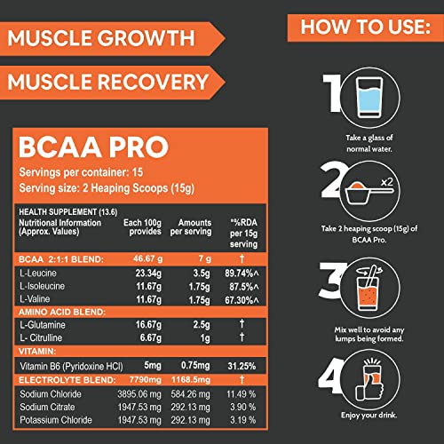 HomeHealth & PersonalDiet & NutritionHealth SupplementsCarbamide Forte BCAA PRO Supplement for Men & Women 15g Serving with L-Glutamine & L-Citrulline|Max Strength BCAA Powder with 1168.5mg Electrolyte Blend & Vitamin B6 Supplement - Orange Flavour -225g