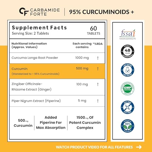 Carbamide Forte Curcumin Tablets with Piperine and 95% Curcuminoids | Anti inflammatory Supplement for Adults | With Curcuma Longa, Turmeric & Ginger Root extract | 60 Veg Tablets