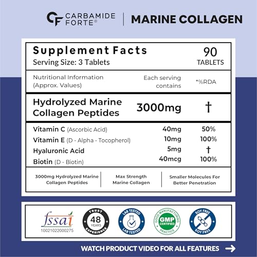 HomeHealth & PersonalDiet & NutritionHealth SupplementsCarbamide Forte Hydrolyzed Marine Collagen Supplements for Women & Men | 3000mg Marine Collagen Tablets for Women & Men | Marine Collagen Peptides with Biotin & Hyaluronic Acid & Hydrolyzed Collagen - Collagen Supplement with Type 1 Marine Collagen Powder
