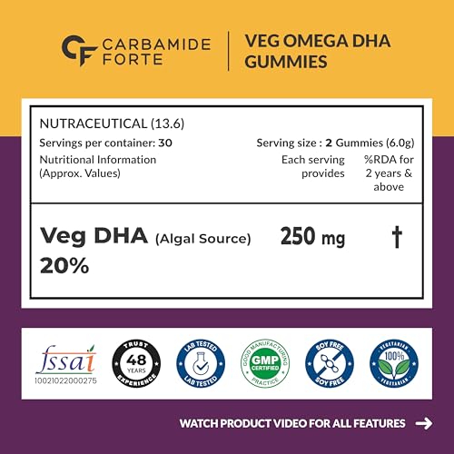 HomeHealth & PersonalDiet & NutritionHealth SupplementsCarbamide Forte Veg Omega3 DHA 250mg - Gummies for Men, Women & Kids with Vegetarian DHA | No Fish oil Used | Omega Veg DHA Gummies | Healthy Heart, Brain & Joints - 60 Veg Gummies