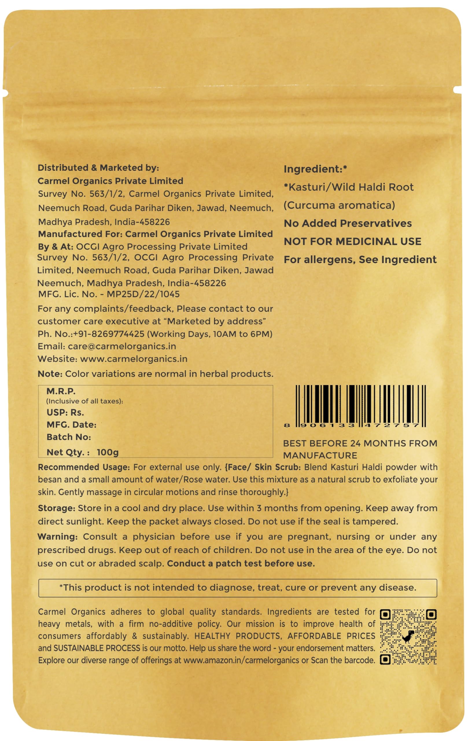 CARMEL ORGANICS Kasturi Haldi/Wild Turmeric Root Powder 100gm | No Added Preservatives | Kasturi Manjal Powder For Your Skin Care | Poolankilangu | Curcuma Aromatica