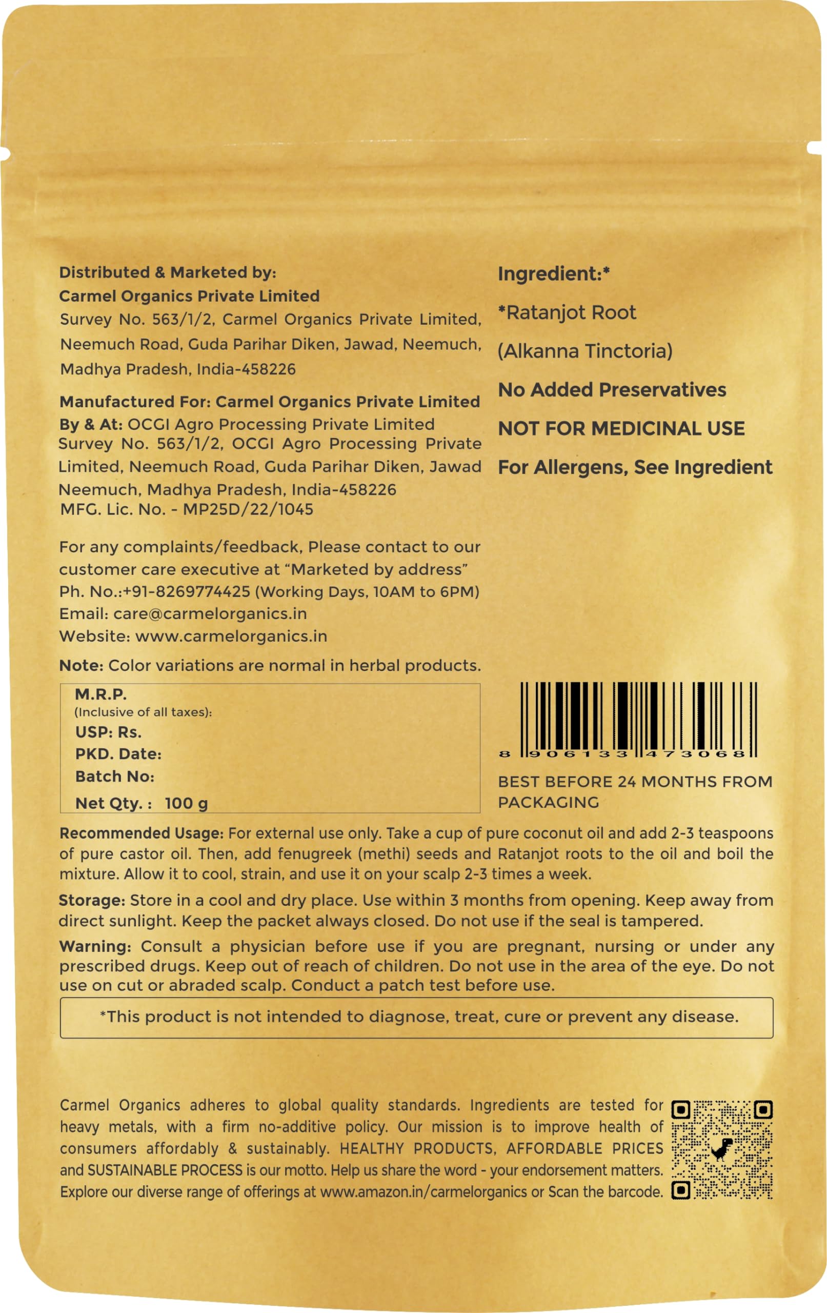 CARMEL ORGANICS Ratanjot Roots 100 Grams | Alkanet Root - Alkanna Tinctoria For Cooking Hair Fall Hair Growth Skin | Natural | Non GMO| No Added Preservatives and Additives