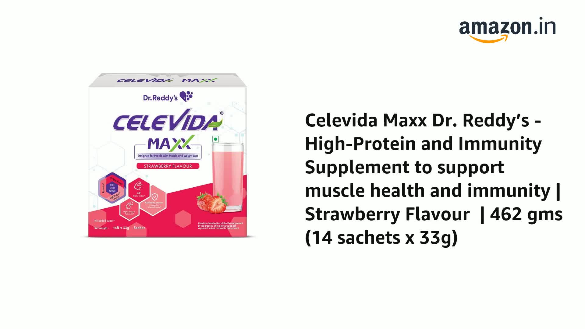 CELEVIDA Maxx is a High Protein supplement used to support muscle health and immunity. It contains 4X high protein promotes muscle strength gives energy and supports immunity. Clinically proven Astaxanthin is 6000 times stronger than Vitamin C an is used to strengthen immune system. It contains Vit C Zinc and other Immuno nutrients to Strengthen Immune system. It has No added sugar and is 100% vegetarian.