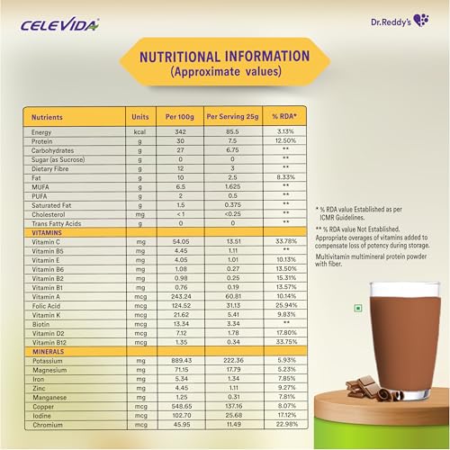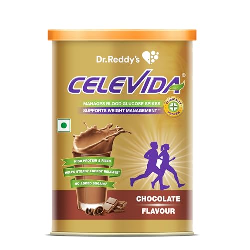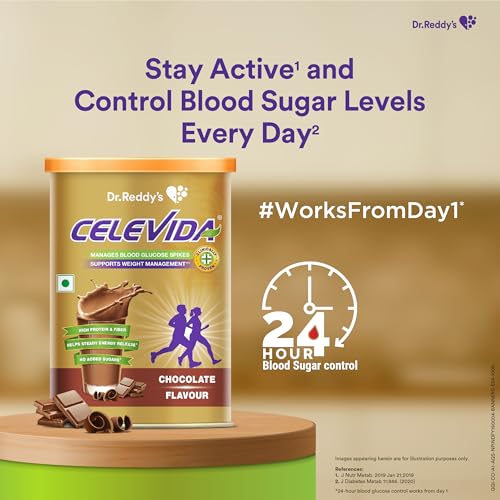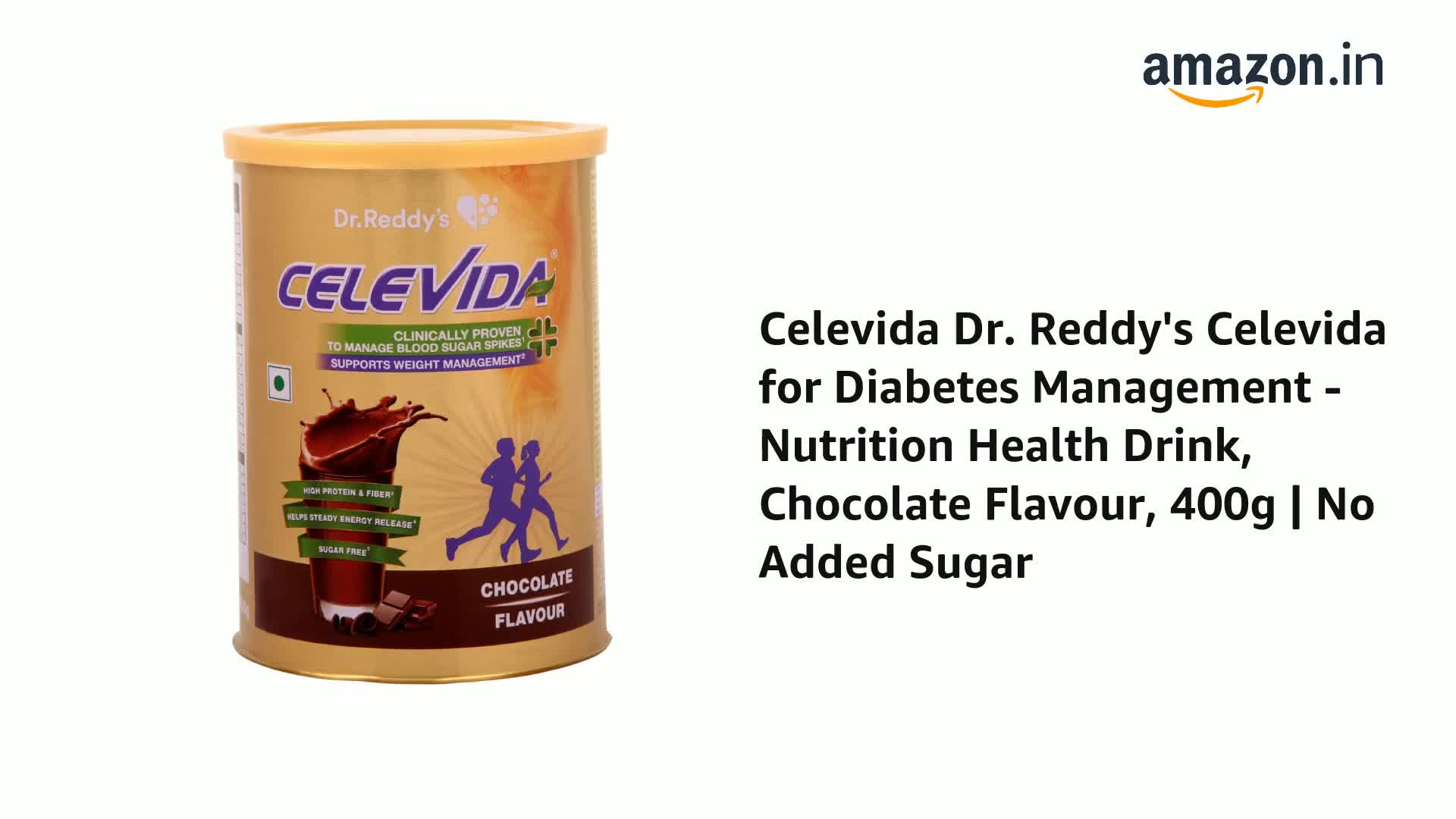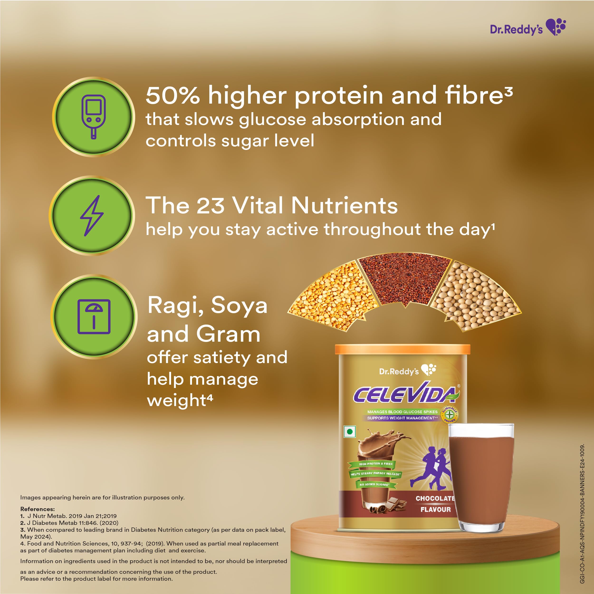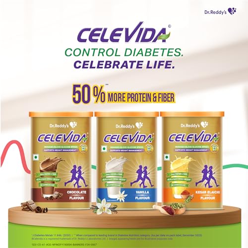 Dr. Reddy's Celevida is a food for special dietary use & a specialised nutrition drink which helps you in diabetes management. It has a balanced mix of protein (28g per 100g) dietary fiber (18g per 100g) slowly digested carbohydrates which support in managing the blood glucose and satiety. It also has 12 nutrients including Vitamin C Vitamin D Vitamin B12 & minerals like Zinc Iron Potassium Magnesium & more making it a perfect addition to support your immunity and healthy diet. Besides blood sugar control it helps in weight management & is good for your heart. Recommended to consume Celevida twice a day or as recommended by your healthcare provider. This is not to be consumed by pregnant nursing & lactating women or by infants children & adolescents except when medically advised. Also available in Kesar Elaichi flavor to tempt your taste buds! Do not consume if you're allergic to soy or milk protein. Disclaimer: Contains artificial sweetener and for calorie conscious this contains sucralose. Not recommended for children. Voted product of the year in nutrition supplement for diabetic category. Winner Nutritional Supplement for Diabetics Category. Survey of 2250 people by NielsenIQ across categories.
