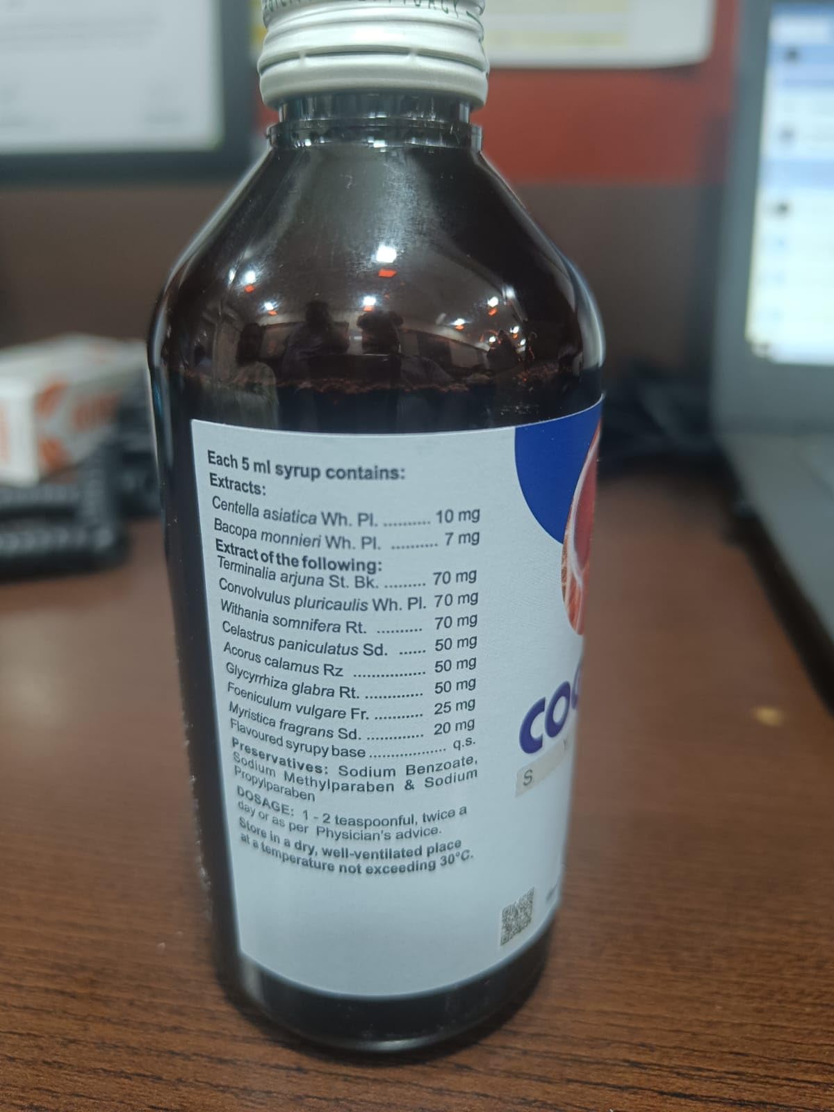 Ingredients: brahmi (100 mg) jala-brahmi (70 mg) arjun chhal (70 mg) shankhapushpi (70 mg) ashwgandha (70 mg) jyotishmati (50 mg) vaj (50 mg) yashtimadhu (50 mg) saunf (25 mg) jaiphal (20 mg) sugar (3000 mg) sodium benzoate (25 mg) sodium methyl paraben (10 mg) sodium propyl paraben (1 mg) citric acid monohydrate (q.s) flavour strawberry (25 mg).