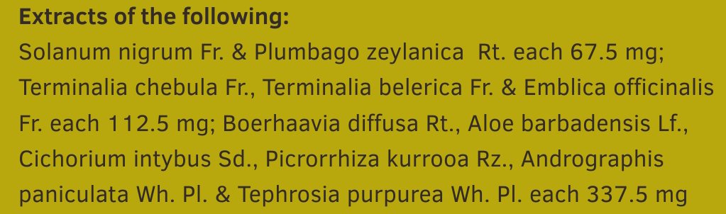 Ingredients: mandur bhasma (56.25 Mg) arogyavardhini ras (112.5 Mg) kakmachi (67.5 Mg) chitrak mool (67.5 Mg) harde (112.5 Mg) baheda (112.5 Mg) amla (112.5 Mg) punarnava (337.5 Mg) kunvar patha (337.5 Mg) kasmi (337.5 Mg) katuki (337.5 Mg) kalmegh (337.5 Mg) sharpunkha (337.5 Mg) maize starch (51.33 Mg) methyl paraben (0.5 Mg) propyl paraben (0.25 Mg) colloidal silicon dioxide (3 mg) magnesium stearate (1 mg) talc (15 mg) light liquid paraffin (9 mg) capsule shell ehg (01 no).