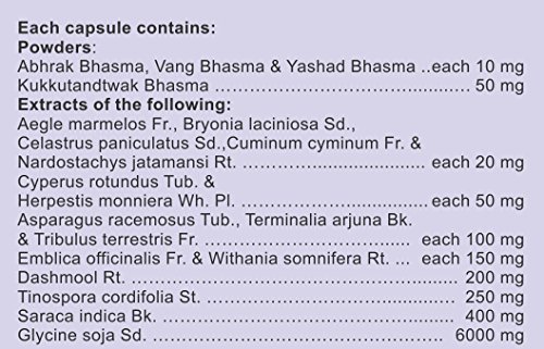 Ingredients: abhrak bhasma (10 mg) vang bhasma (10 mg) yashad bhasma (10 mg) kukkuratandtwak bhasma (50 mg) bael (20 mg) jeera (20 mg) jatamansi (20 mg) jyotishmati (20 mg) shivlingi (20 mg) brahmi (50 mg) nagarmotha (50 mg) gokhru (100 mg) arjun chhal (100 mg) shatavari (100 mg) amla (150 mg) ashwagandha (150 mg) dashmool (200 mg) galo (250 mg) ashok chhal (400 mg) soya (6000 mg) maize starch (141.33 Mg) methyl paraben (0.5 Mg) prophyl (0.25 Mg) colloidal silicon dioxide (3 mg) magnesium stearate (1 mg) talc (15 mg) light liquid paraffin (12 mg).