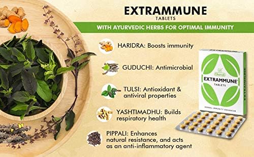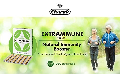 Charak Pharma Extrammune Tablets To Boost Immunity Pack Of 3 (30 Tablet Each Pack). Poor immunity in general has a huge negative impact on the productivity in school at work and even within the family. It is important to have a well functioning immune system by following a healthy lifestyle and incorporating Ayurvedic immunity enhancing herbs like Guduchi and pippali. The immune modulating herbs like Guduchi Yashtimadhu Pippali Tulsi improve bodys natural defense by stimulating the production and activity of infection-fighting cells. In addition these herbs offer antiviral antibacterial anti-infective anti-inflammatory antioxidant properties along with working as a respiratory tonic & a blood purifier.