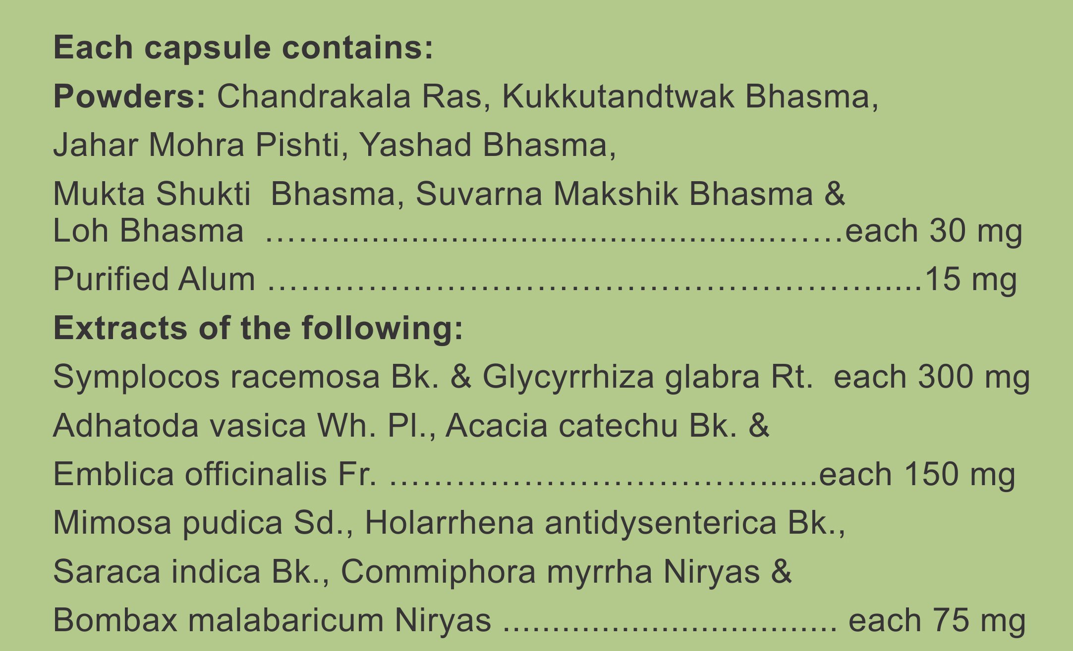 Ingredients: phitsari shuddha (15 mg) char drakala ras (30 mg) char drakala ras (30 mg) kuklrtandtwak bhasma (30 mg) jaha mohra pishti (30 mg) yastad bhasma (30 mg) mukta shukti bhasma (30 mg) suvarna makshik bhasma (30 mg) loh bhasma (30 mg) lajjalu (75 mg) kutaj chhal (75 mg) ashok chhal (75 mg) hirabol (75 mg) shahnali gond (75 mg) ardusi (150 mg) khair chhal (150 mg) amla (150 mg) yashtimadhu (300 mg) loclha (300 mg) maize starch (87.83 Mg) methyl paraben (0.5 Mg) propyl paraben (0.25 Mg) colloidal silicon dioxide (3 mg) magnesium stearate (2 mg) talc (20 mg) light liquid paraffin (15 mg) capsule shell ehg 1 size (01 no.).
