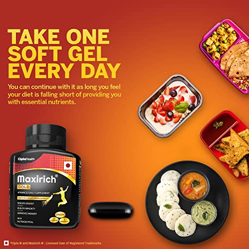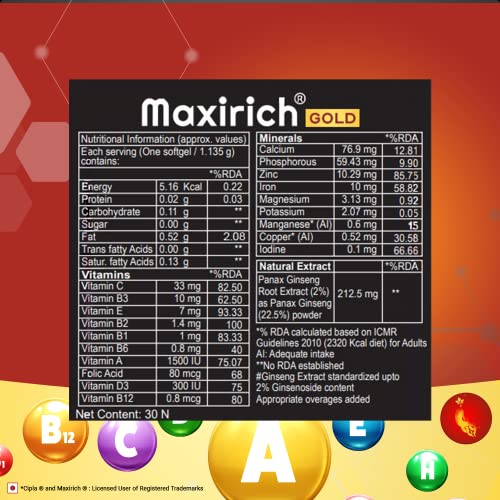 The softgels are convenient to take, and the inclusion of high-purity grade Ginseng Extract along with 10 vitamins and 9 minerals caught my attention. The combination aims at boosting energy, improving immunity, reducing fatigue, and enhancing mental alertness.I've noticed a gradual increase in energy levels throughout the day, making it easier to stay focused and alert. The multivitamin's impact on immunity is reassuring, especially in times when maintaining a strong immune system is crucial.The softgels are easy to digest, and I haven't experienced any discomfort after taking them. The packaging is travel-friendly, allowing for consistency in consumption even when on the go.While it's challenging to attribute all improvements solely to the multivitamin, I believe it plays a role in supporting overall well-being. The Ginseng Extract, in particular, seems to contribute positively to sustained energy levels.If you're in search of a comprehensive daily multivitamin that goes beyond basic requirements, the Cipla Maxirich Gold is worth considering. It offers a combination of vitamins, minerals, and Ginseng Extract to provide a holistic boost for energy, immunity, and mental alertness.