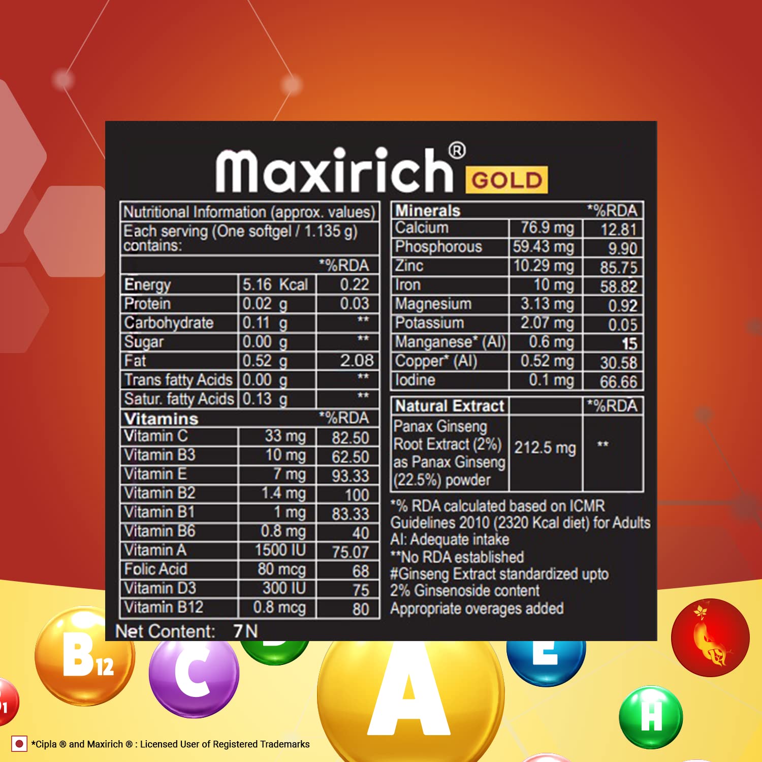 Summi 25/04/2024 Advantages Feel fully energetic and fatigue free after taking MaxiRich Gold Capsules.Health is greater than wealth. Worth the money ?? more Comment Best Multivitamin and multi mineral capsule available in India more