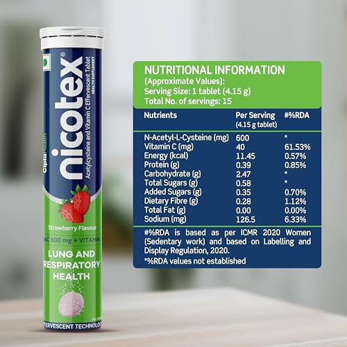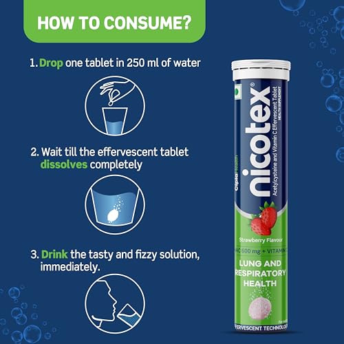 Nicotex Lung and Respiratory Health Effervescent tablets help relieve airway congestion reduce inflammation and oxidative stress. It contains NAC and Vitamin C which helps in body detoxification and maintaining respiratory health.