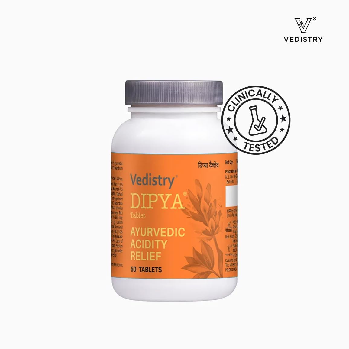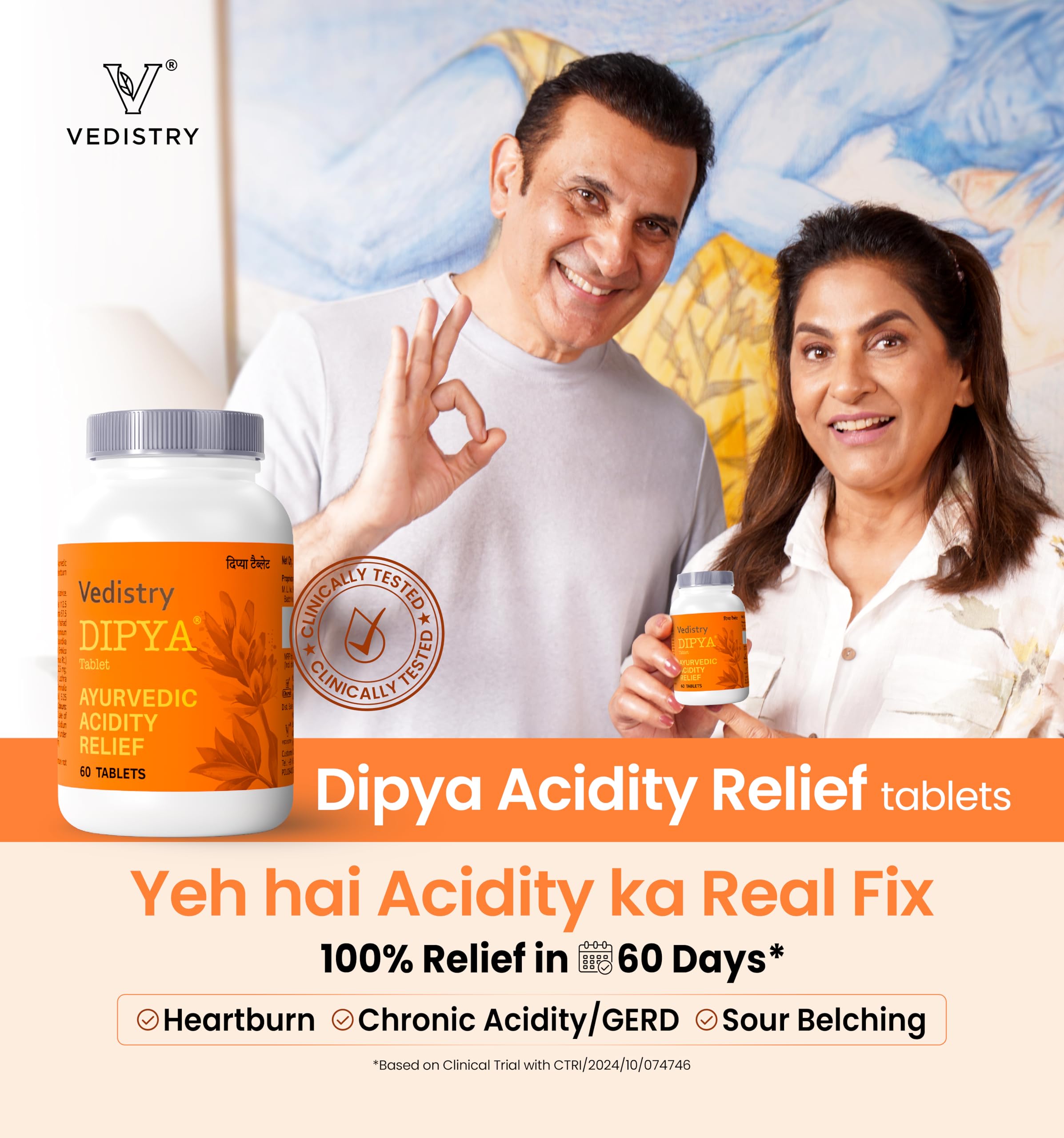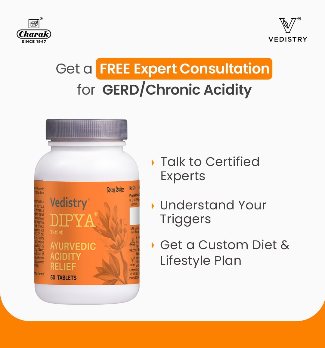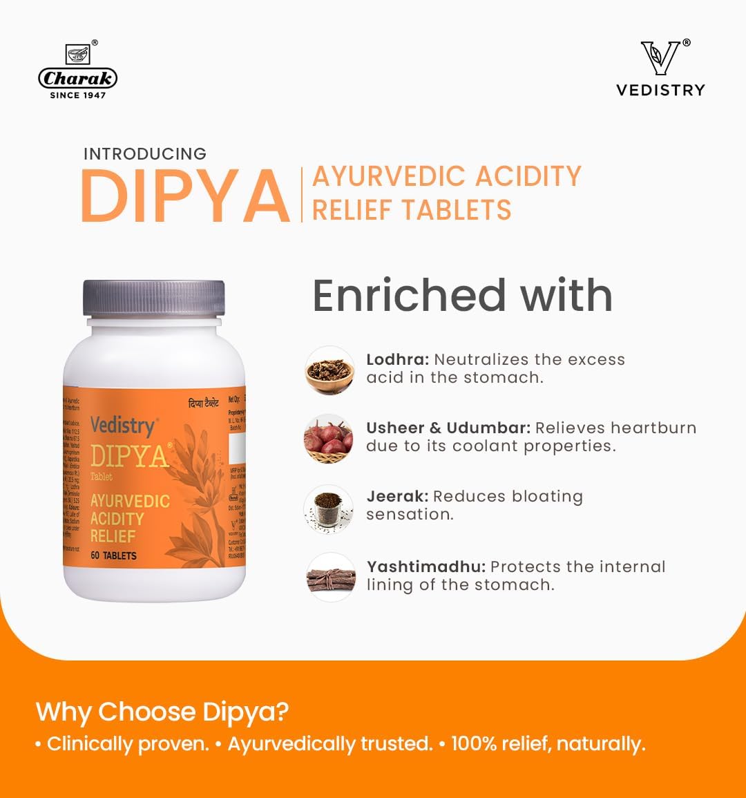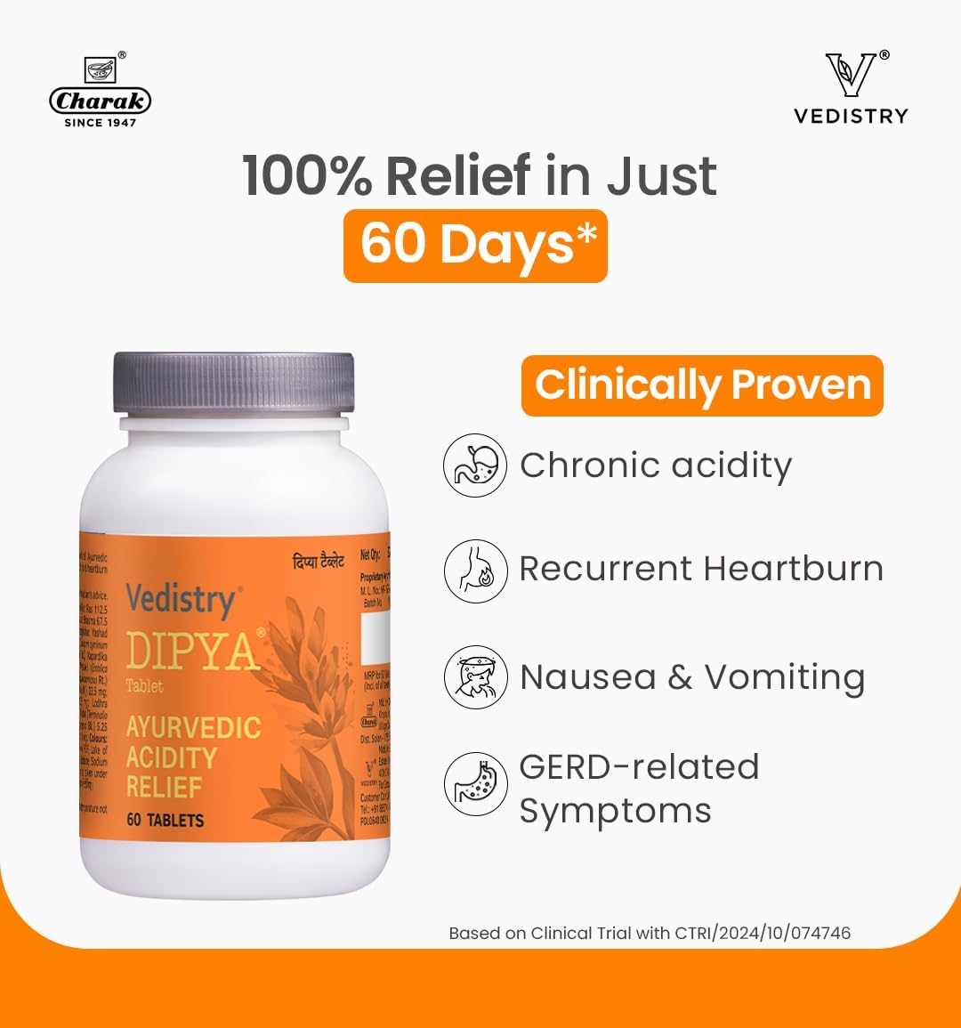 Clinically Proven Vedistry Dipya Acidity Relief Tablet for Chronic Acidity & GERD symptoms |Natural & Safe Ayurvedic Antacid| 100% relief in 30 days| 60 Tablets