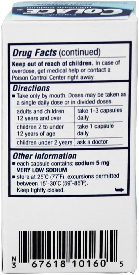 Relieve occasional constipation safely gently and effectively with Colace Regular Strength Capsules (60-Count). Docusate sodium the active ingredient in Colace Capsules allows water and fats to get into the stool. This helps soften fecal material and makes defecation more comfortable. Docusate sodium is not a stimulant laxative. Occasional constipation can be caused by diet stress travel pregnancy or aging. Letâ¬s face it: constipation happens. More than 63 million people in North America experience constipation making it one of the most common gastrointestinal complaints. From infrequent or painful bowel movements to excessive bloating you just donâ¬t feel like yourself when youâ¬re constipated. Whatever your reason treat your occasional constipation with Colace safely gently and effectively. For over 60 years doctors have recommended Colace Stool Softener Products for gentle dependable effective relief of occasional constipation.