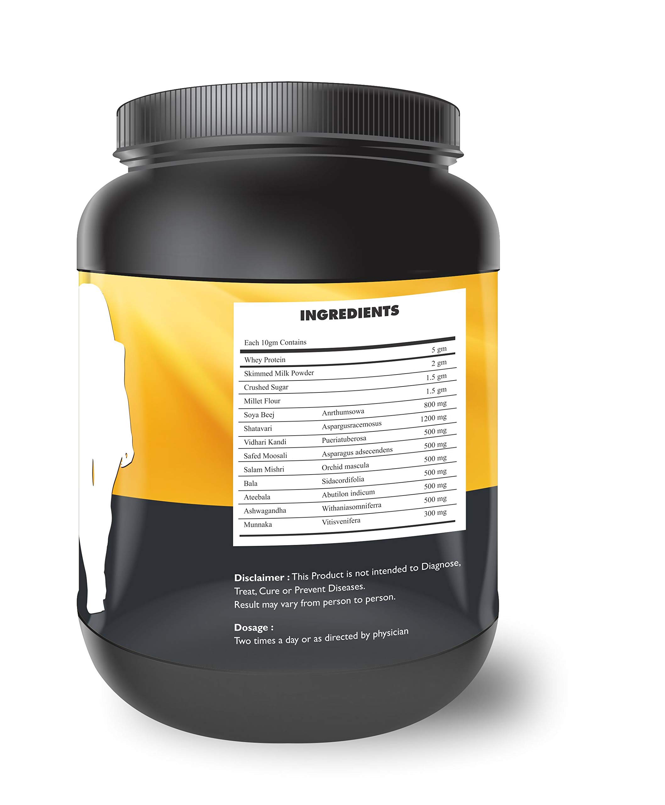 Ingredients: (each 10 gms): whey protein 5 gm skimmed milk powder 2 gm crushed sugar 1.5 gm millet flour 1.5 with: soya beej(anrthum sowa) 800 mg shatavari(asparagus racemosus) 1200 mg vidhari kandi(pueria tuberosa) 500 mg safed moosali(asparagus adsecendens) 500 mg salam mishri(orchid mascula) 500 mg bala(sida cordifolia) 500 mg ateebala(abutilon indicum) 500 mg ashwagandha(withania somniferra) 500 mg munnaka(vitis venifera) 300 mg.