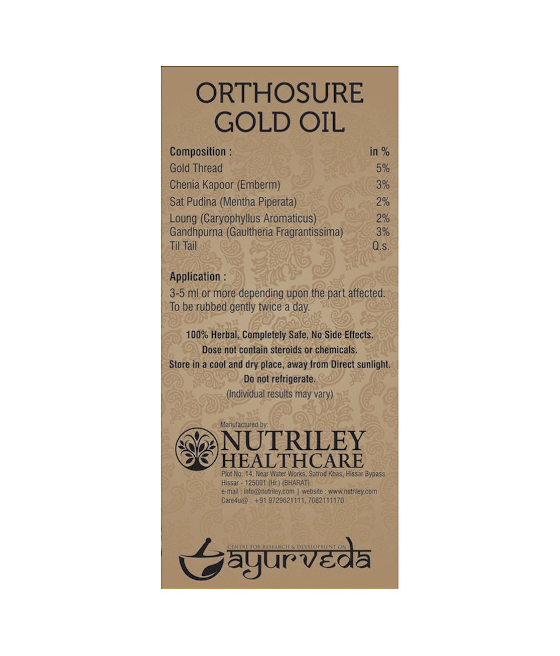 Composition (oil): mamira (gold thread/coptis teeta will) 5% chenia kapoor (cinnamomum camphora nees & emberm) 3% sat pudina (mentha piperata) 2% loung (caryophyllus aromaticus) 2% gandhpurna (gaultheria fragrantissima) 3% til (sesamum indica) q. S.