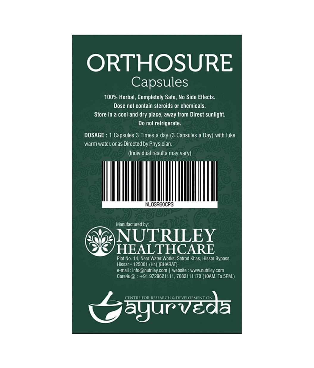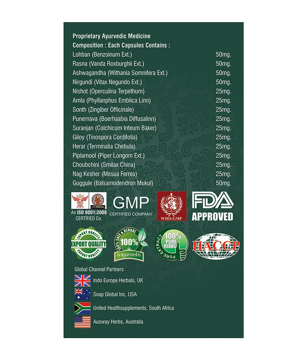 Composition (each capsule contains): lohban (benzoinum) 50 mg rasna (vanda roxburghii) 50 mg ashwagandha (withania somnifera) 50 mg nirgundi (vitax negundo) 50 mg nishot (operculina terpethum) 25 mg amla (phyllanphus emblica linn) 25 mg sonth (zingiber officinale) 25 mg punernava (boerhaabia diffusalinn) 25 mg suranjan (colchicum inteum baker) 25 mg giloy (tinospora cordifolia) 25 mg herar (terminalia chebula) 25 mg piplamool (piper longom) 25 mg choubchini (smilax china) 25 mg nag kesher (mesua ferrea) 25 mg guggule (balsamodendron mukul) 50 mg.
