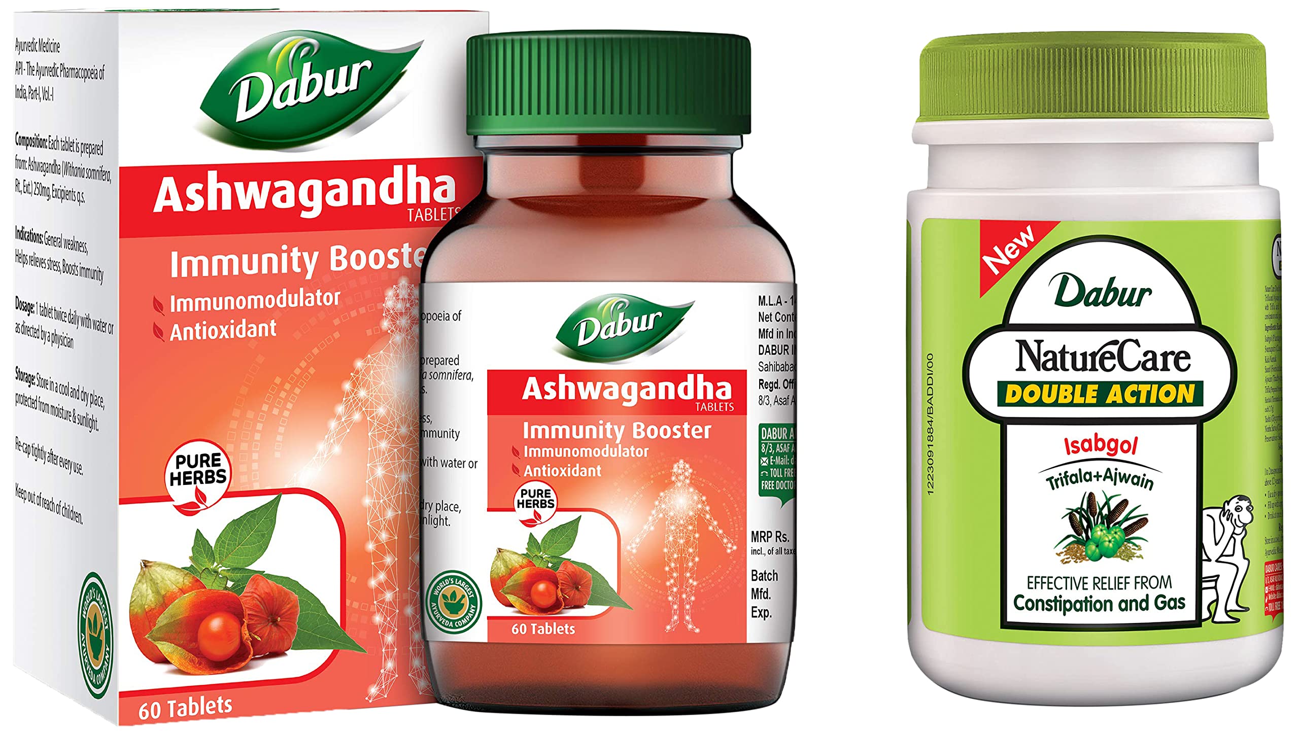 Dabur Ashwagandha - General Wellness Tablets | Stress Relief | Rich in Antioxidants - 60 tabletsWith over 130 years of expertise in ayurveda dabur has always been committed to the health and well-being of every household. Power packed with the age-old wisdom of ayurveda dabur pure herbs range of tablets is the latest offering from the house of dabur in fulfilling this vision. The immunity boosting dabur ashwagandha tablets in our range have the goodness of ashwagandha in it. Dabur Ashwagandha Tablets are 100 % Ayurvedic Immunity booster tablets that help strengthen your immunity. Ashwagandha is an immunomodulator that helps boost the immunity and it also has antioxidant properties. Ashwagandha also helps with general weakness and in relieving stress levels thereby making it a perfect choice for your overall health. For best results take one tablet twice everyday with water (or as directed by the physician)Dabur Nature Care Isabgol Double Action Trifala And Ajwain Effective Relief From Constipation And Gas - 100 GmThe 135-year-old ayurvedic company promoted by the burman family started operating in 1884 as an ayurvedic medicines company. From its humble beginnings in the bylanes of calcutta dabur india ltd has come a long way today. Overall dabur has successfully transformed itself from being a family-run business to become a professionally managed enterprise. What sets dabur apart from the crowd is its ability to change ahead of others and to always set new standards in corporate governance & innovation.